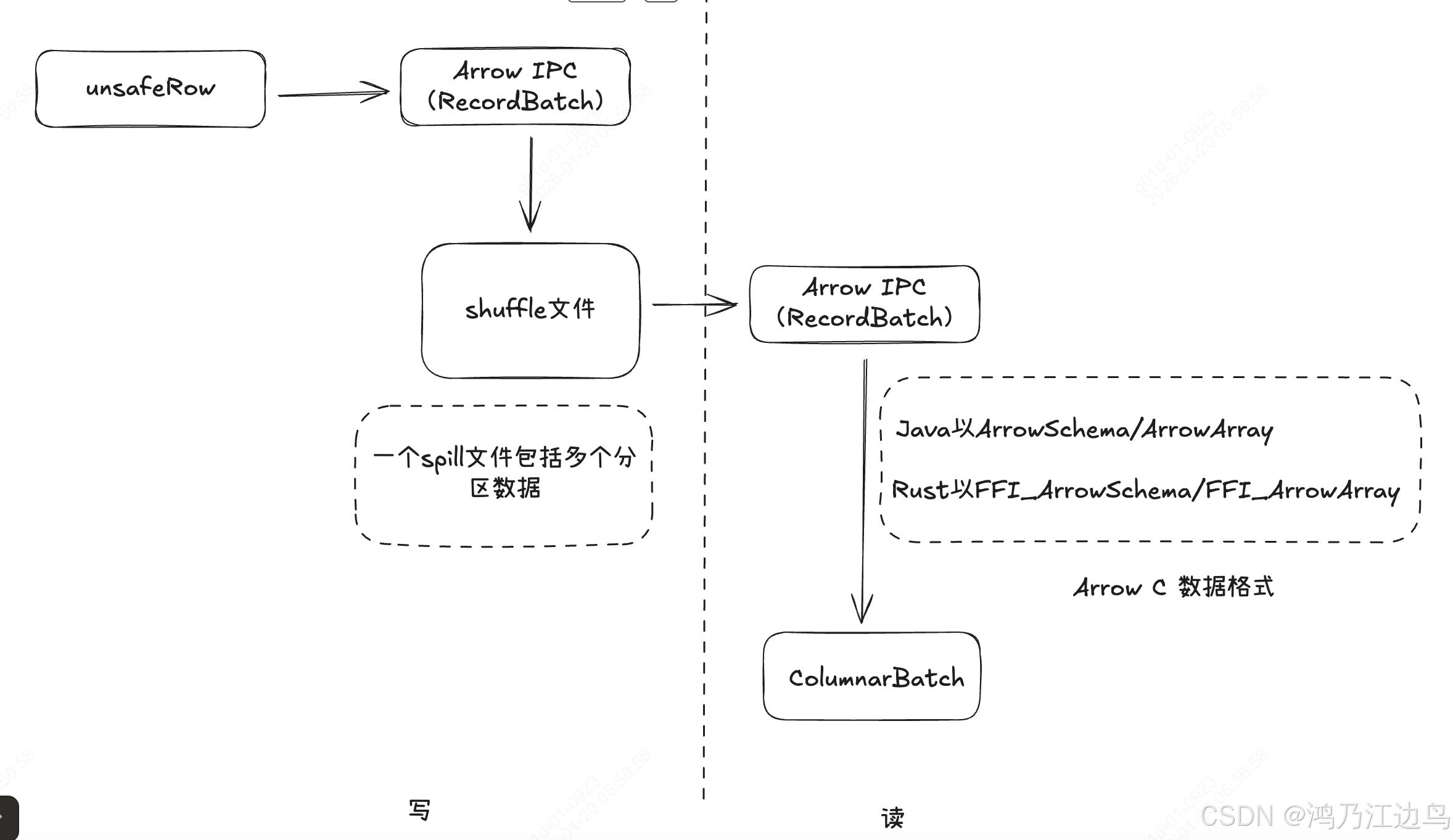 Arrow IPC(RecordBatch)格式存储到Shuffle中间文件中,数据流如下: