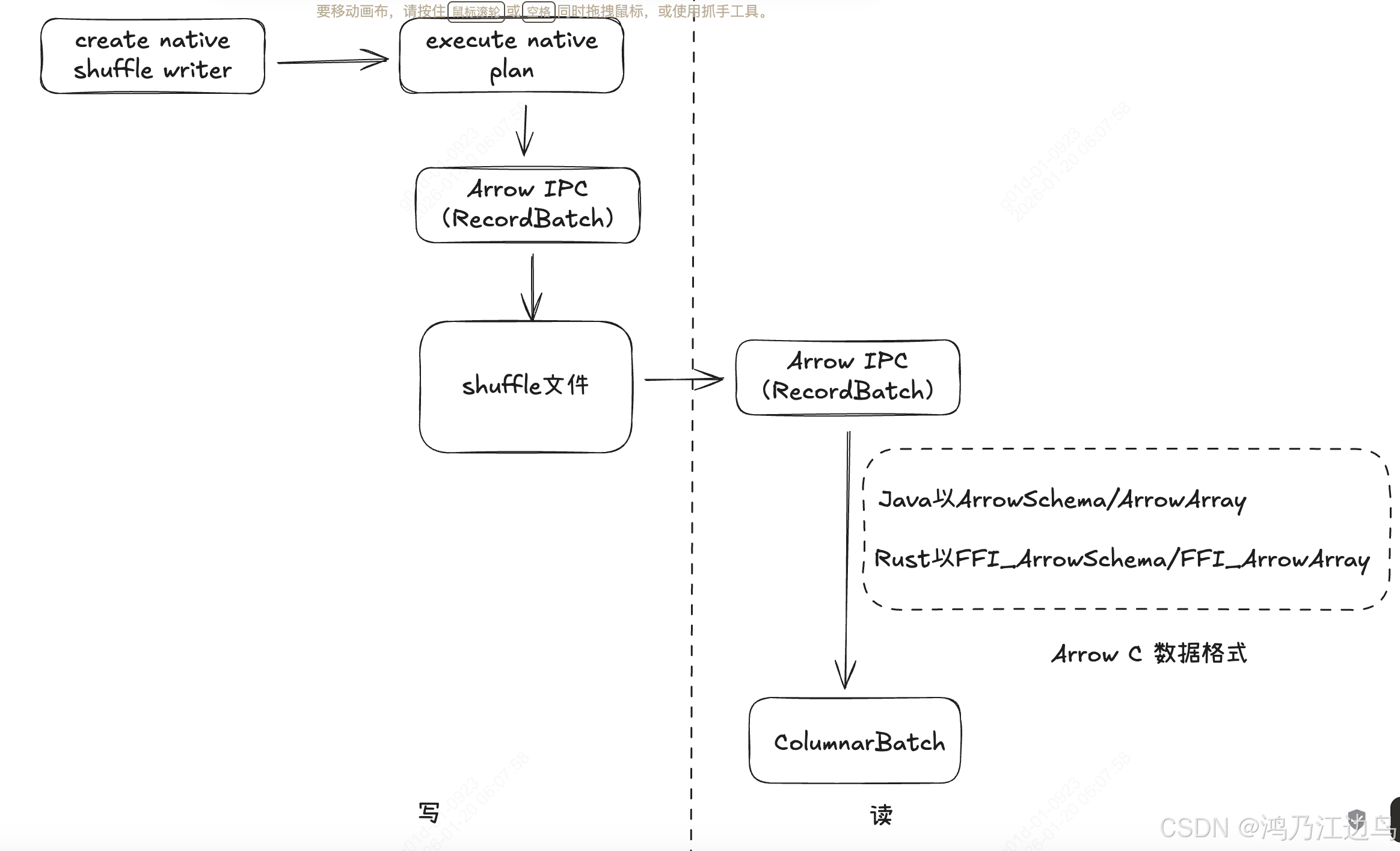 而读取的时候,会以`ArrowC`格式(java以 ArrowSchema/ArrowArray Rust以FFI_ArrowSchema/FFI_ArrowArray数据结构)jvm以jni的方式调用Rust的方式读取数据,这种就会减少多进程间的序列化和反序列化的开销。