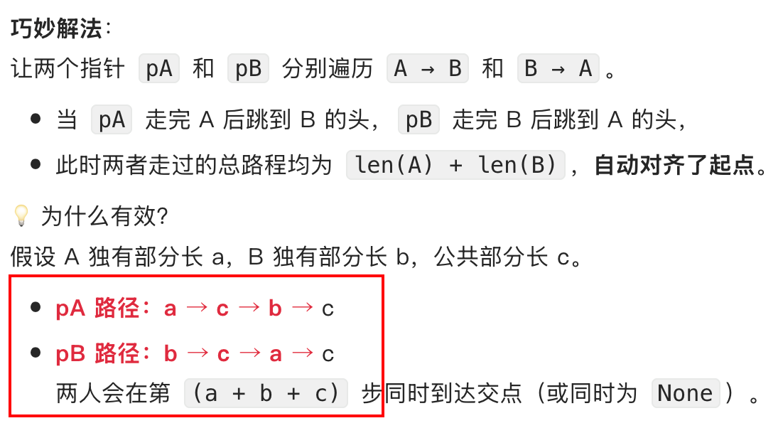 让两个指针 pA 和 pB 分别遍历 A → B 和 B → A。