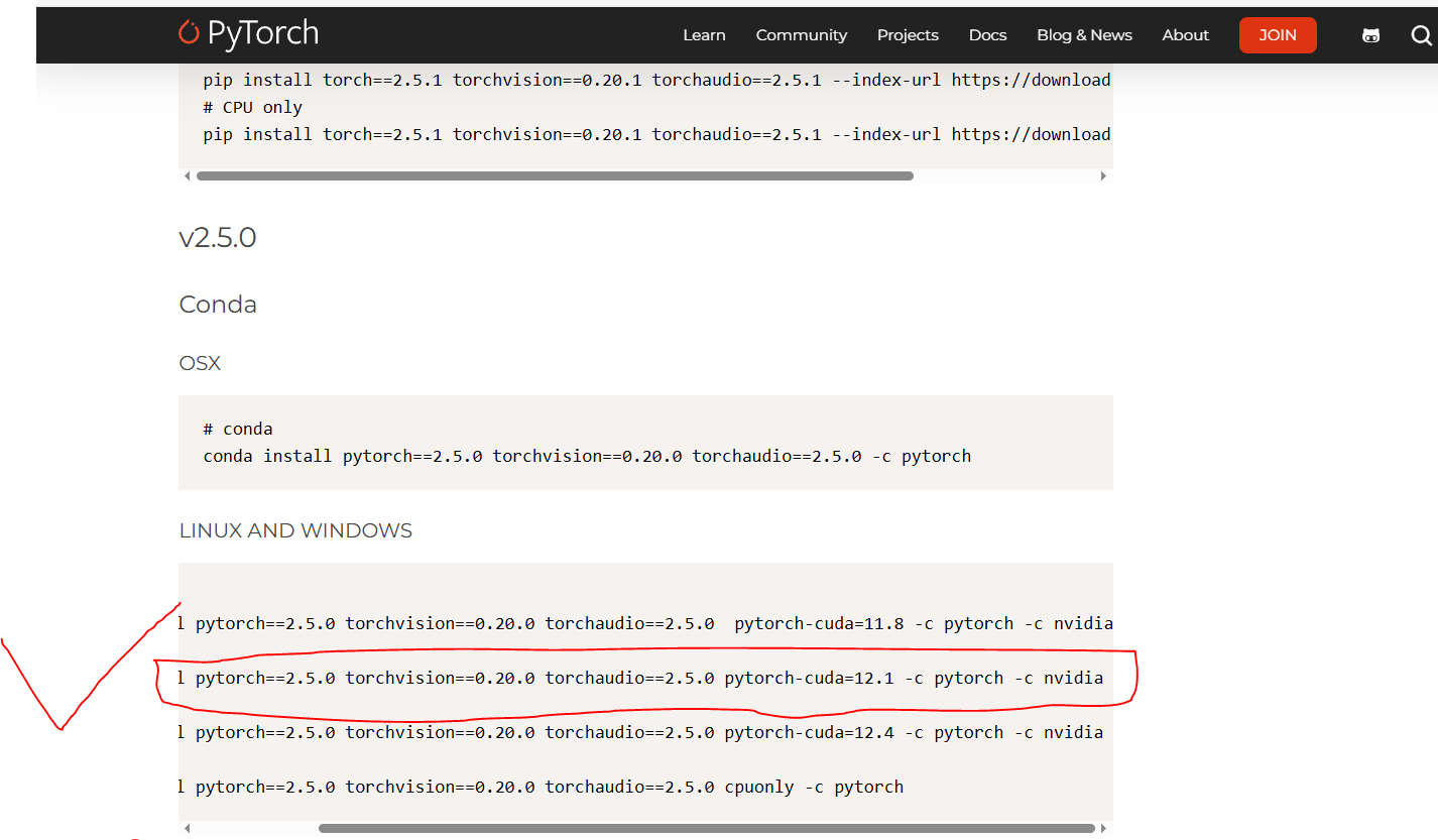 | 参考PyTorch官网确定配套版本 | 根据你安装PyTorch的命令,确认与之匹配的CUDA版本。 | |