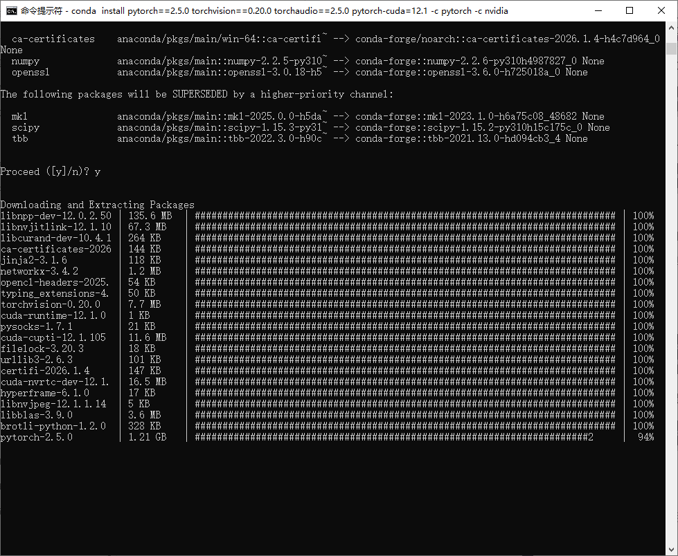 conda install pytorch==2.5.0 torchvision==0.20.0 torchaudio==2.5.0 pytorch-cuda=12.1 -c pytorch -c nvidia