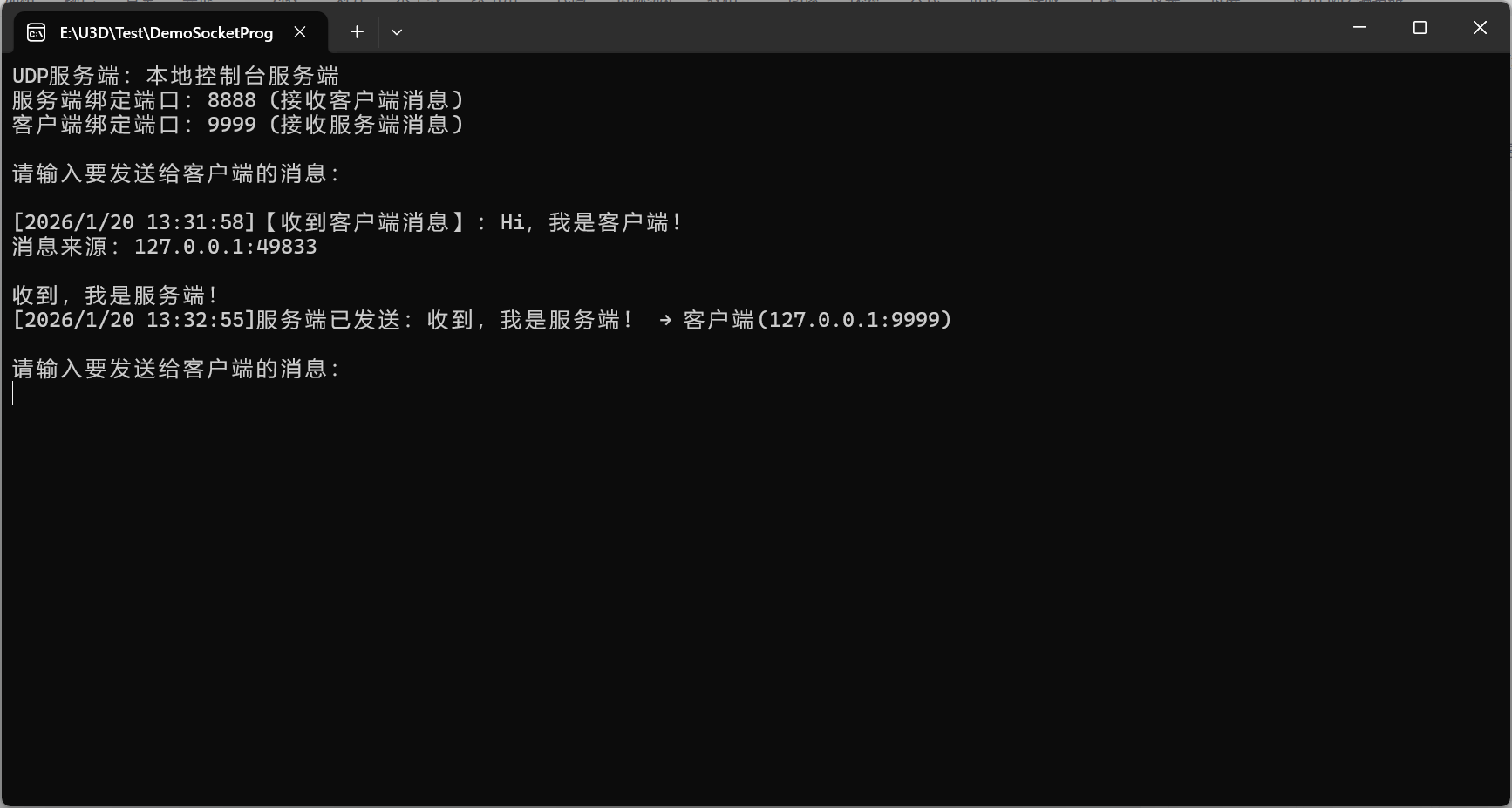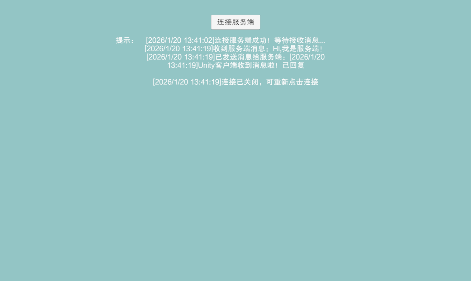 tipContent.text = $"[{DateTime.Now}]发送成功:{sendStr}\n发送至:{serverIP}:{serverListenPort}\n客户端可继续收发消息";