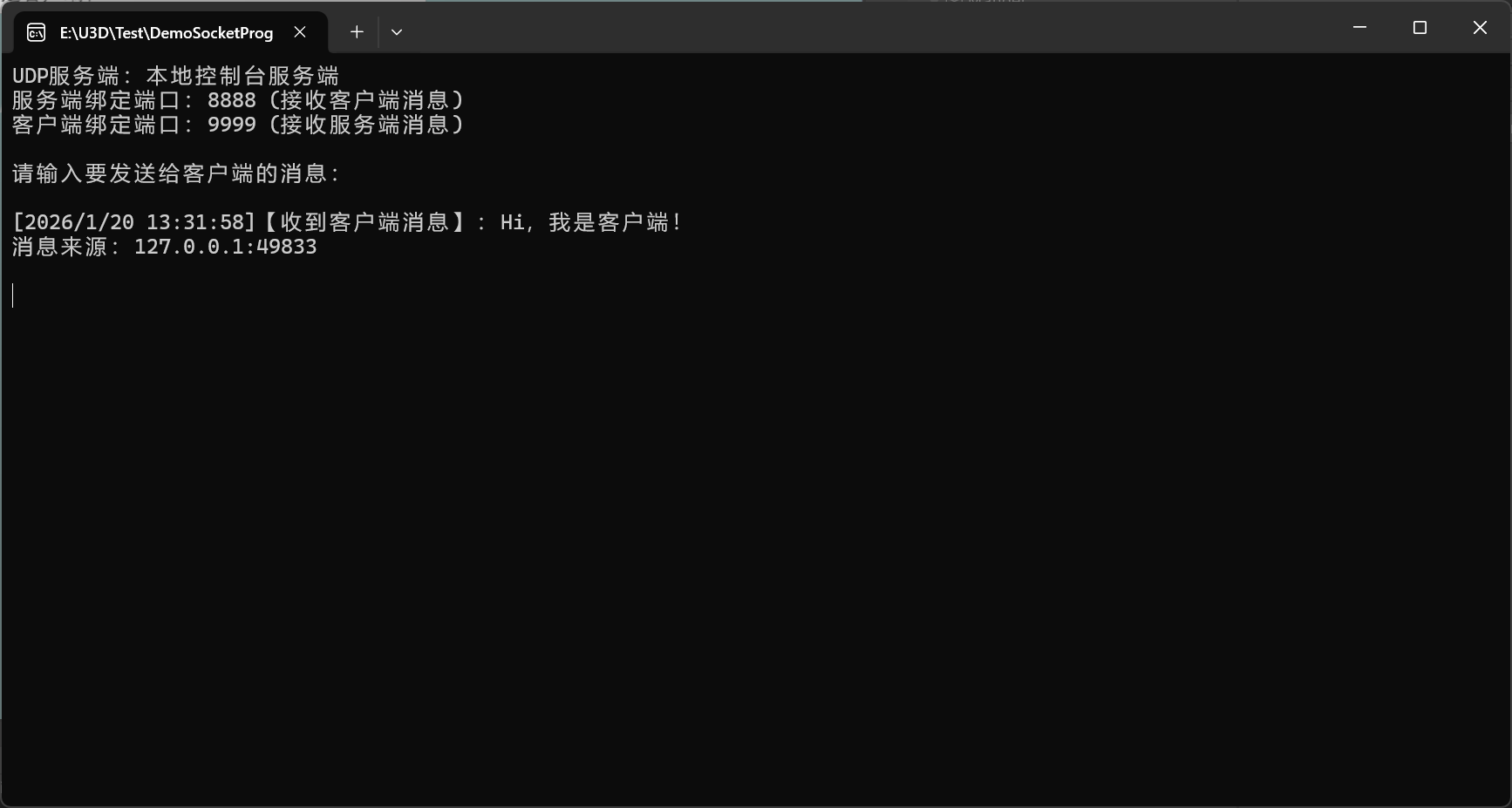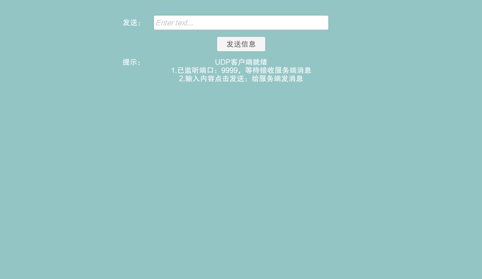 tipContent.text = $"UDP客户端就绪\n1.已监听端口:{clientListenPort},等待接收服务端消息\n2.输入内容点击发送:给服务端发消息";
