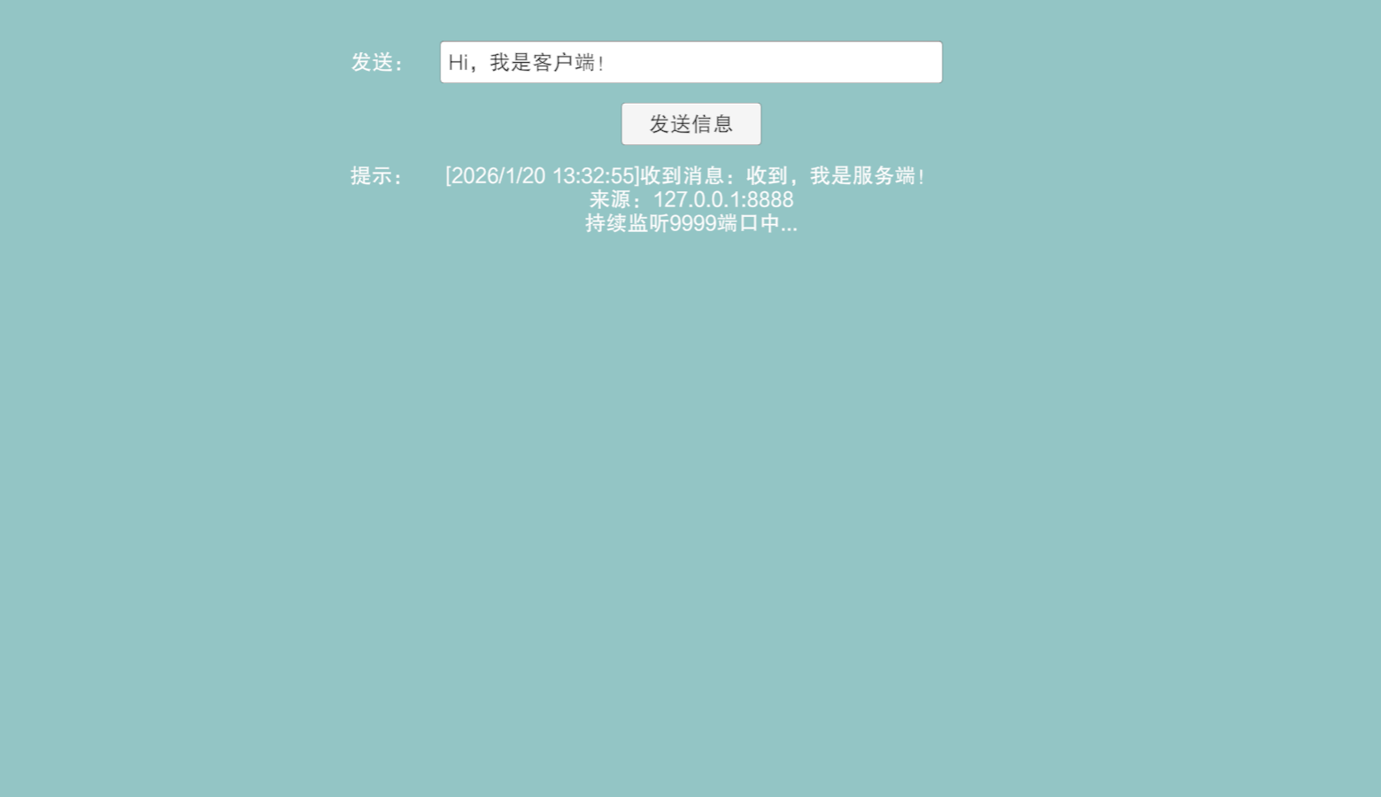 Console.WriteLine($"[{DateTime.Now}]服务端已发送:{sendInfo} → 客户端({clientIP}:{clientListenPort})");