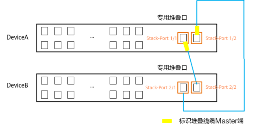 专用堆叠线缆的两端区分主和备,带有Master标签的一端为主端,不带有标签的一端为备端。