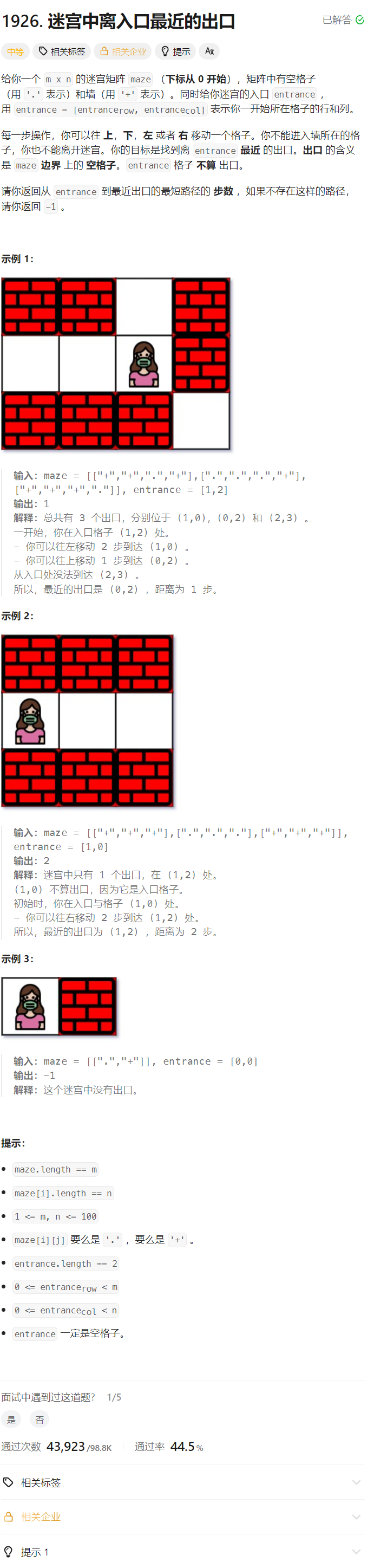int nearestExit(vector<vector<char>>& maze, vector<int>& enter) {