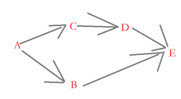 我们看到上面这张图片,求 A 到 E 的最短路径,此时我们可以使用一个队列来实现层序遍历来实现 BFS 算法,我们先把 A 入队列,假设两点之间的距离都为 1,所以此时队列情况: