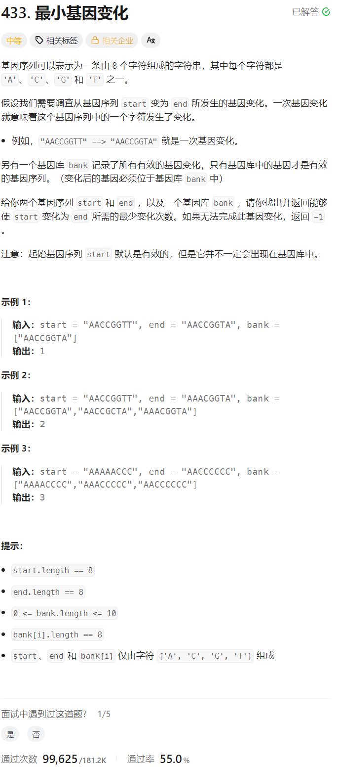 我们要创建两个哈希表,一个用来存储以往入队列的字符串,防止我们枚举的合法的字符串再次入队列,另外一个存储基因库,用来快速查找我们枚举的字符串是否是合法的;