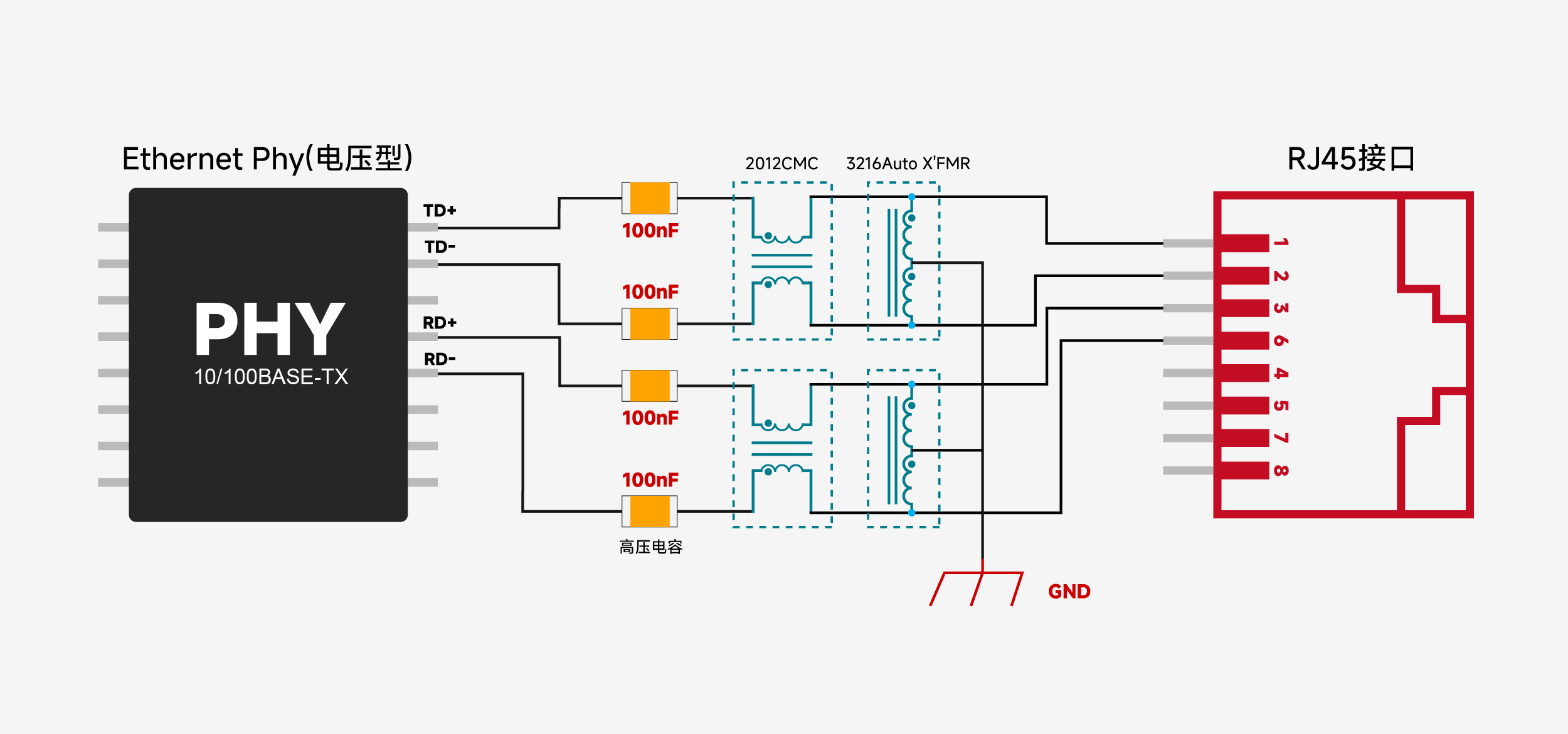 - 电流驱动型PHY :2线共模电感必须放在线缆(RJ45)侧。