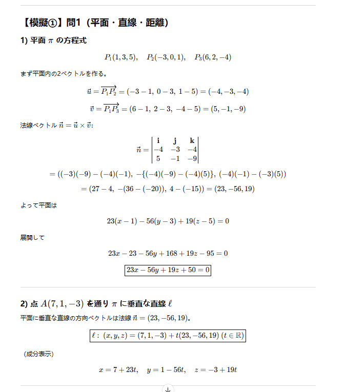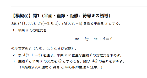 【模擬①】問1(平面・直線・距離:符号ミス誘導)