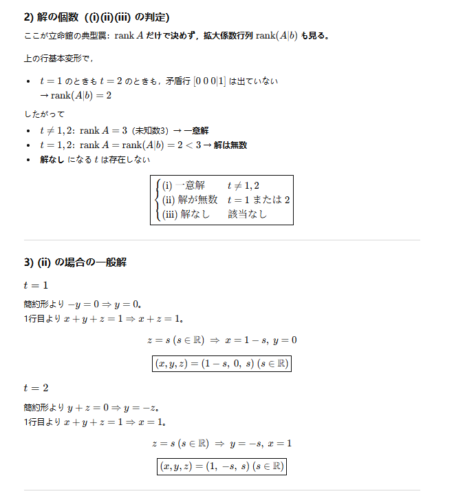 (※「階数=未知数の個数」などの判定で、拡大係数行列を見落とすのが典型的な罠。)