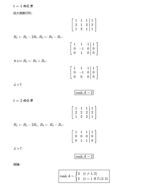 係数行列の階数 (\operatorname{rank}) を (t) により場合分けして求めよ。