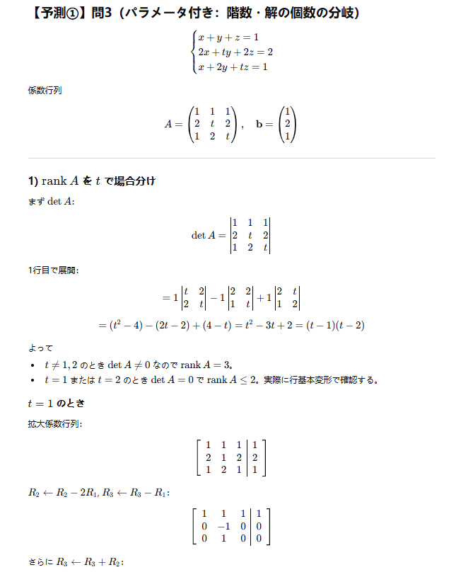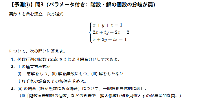 【予測①】問3(パラメータ付き:階数・解の個数の分岐が罠)