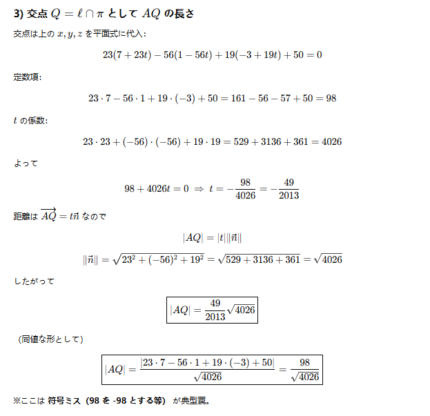 直線 (\ell) と平面 (\pi) の交点を (Q) とするとき、線分 (AQ) の長さを求めよ。
