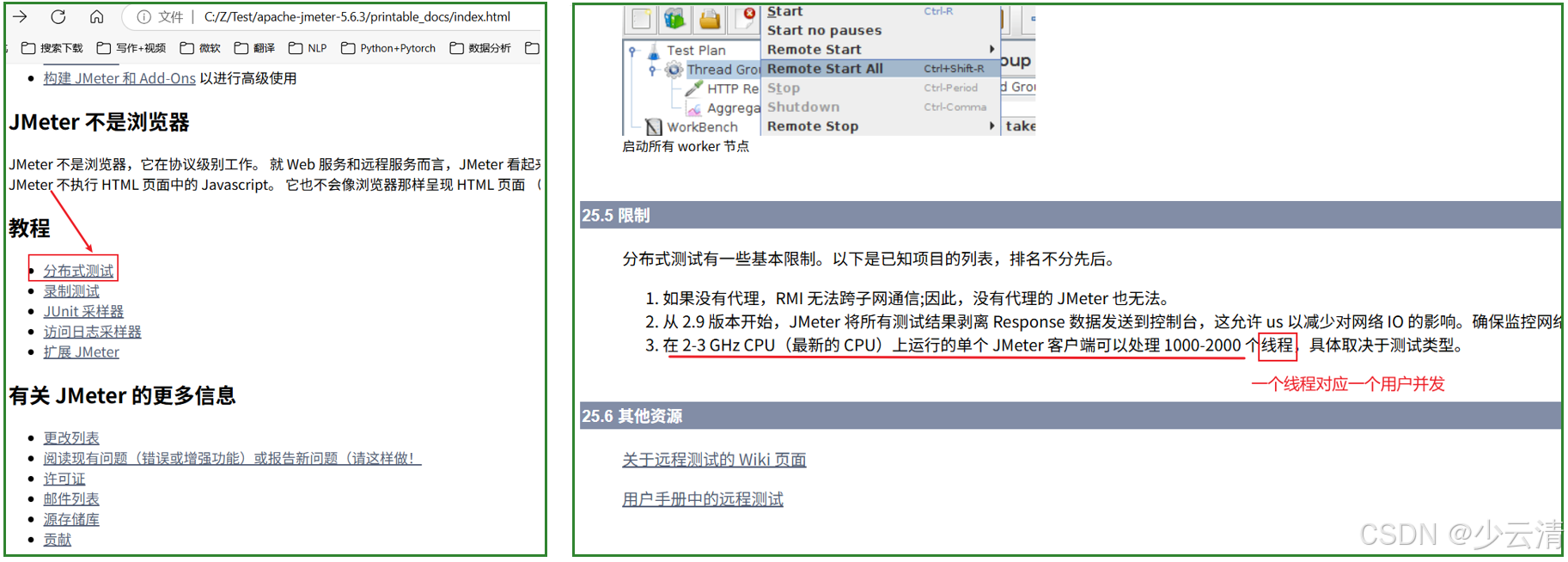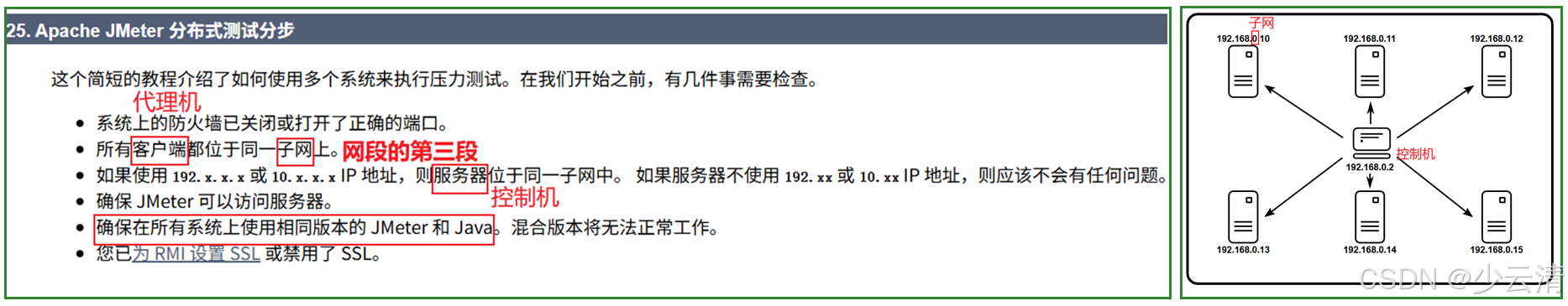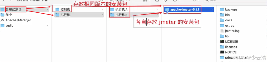- 在使用JMeter进行性能测试时, 如果并发数比较大(比如项目需要支持10000并发), 单台电脑的(CPU和内存)可能无法支持, 这时可以使用JMeter提供的分布式测试的功能。