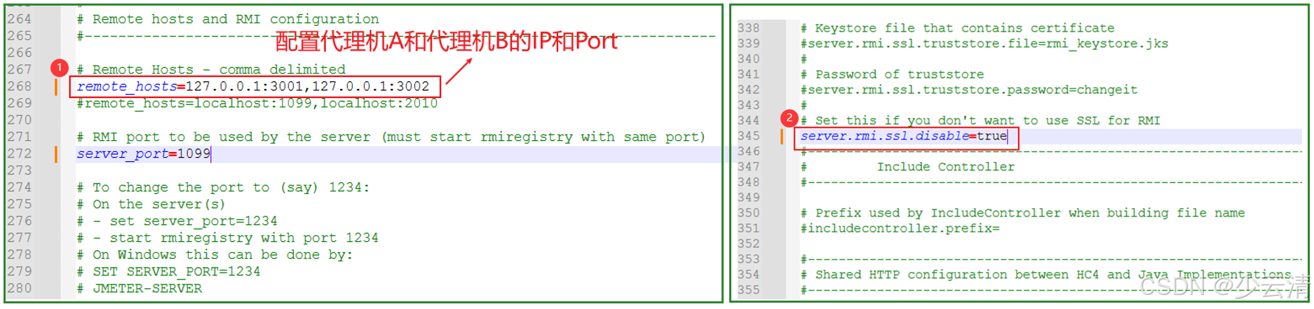1. 修改bin/jmeter.properties文件下`remote_hosts`,IP和port是代理机的。如果有多个用英文逗号隔开。