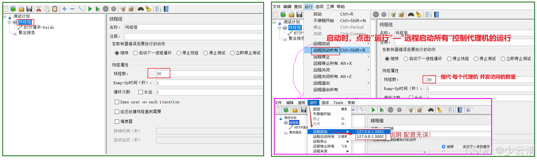 2、控制机:进入bin目录下,执行jmeter.bat。启动时,点击"运行"---"远程启动所有"控制代理机的运行 。