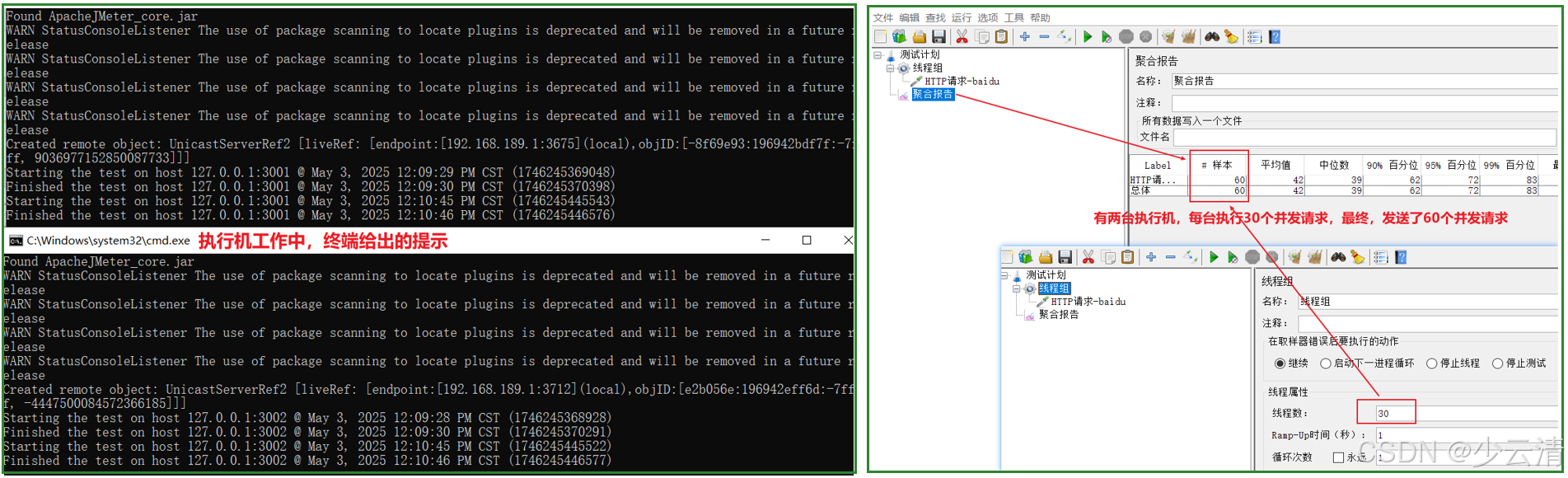目标:60次并发访问。线程数=30 (因为有2台分布式机器,控制机只是汇总数据)