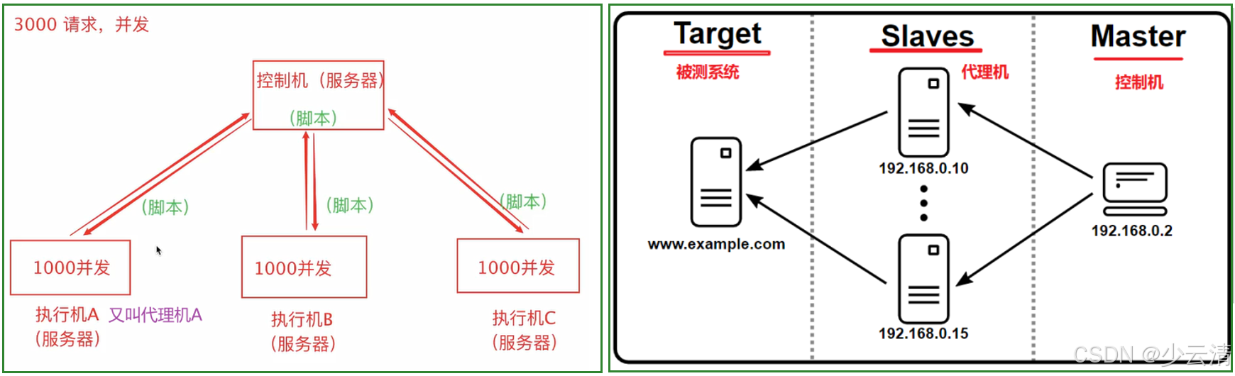 - 分布式测试时通常由1台控制机和N台代理机组成。