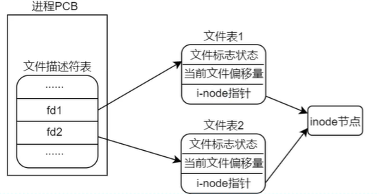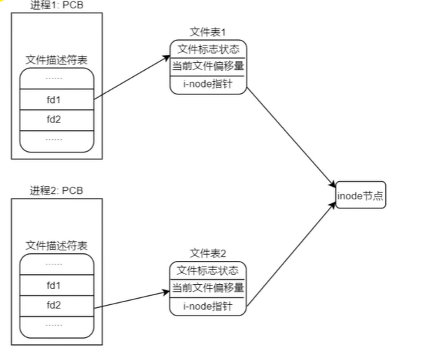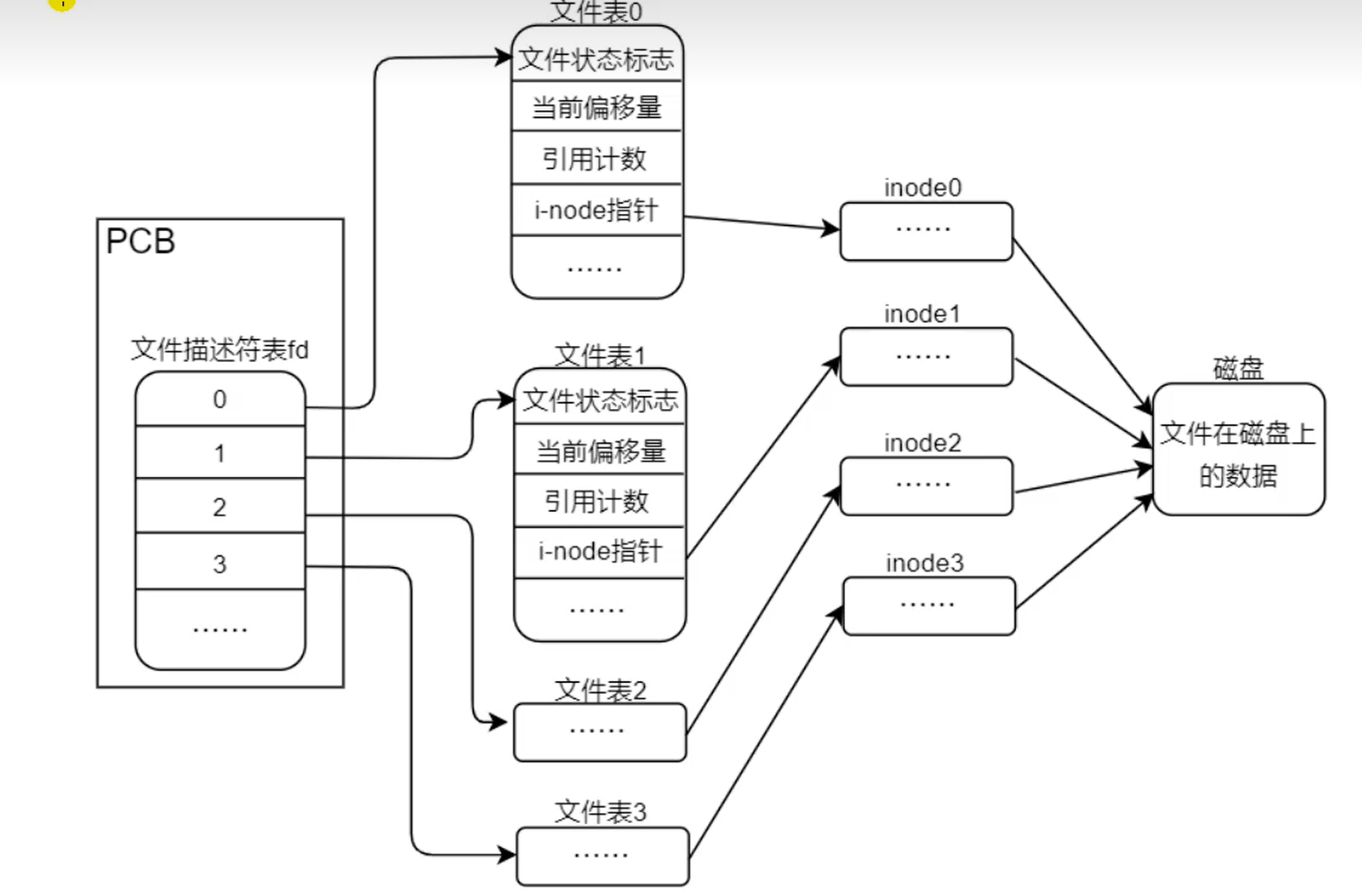 其中inode表中的inode123等称为inode节点 ,inode节点里面存储着对应文件的很多信息 当然也保存对应文件的地址通过里面的信息就可以找到存储在数据区中的文件内容 。PCB即进程控制块,在该结构里面有一个文件描述符表 ,文件描述表里面存放的内容一个是该进程打开的文件的文件描述符 和一个指向文件表的指针 ,通过指针可以访问到对应的文件表,文件表里面又存储着关于该进程打开文件的信息比如读写指针偏移量 、inode指针等其中inode指针又指向了inode表中的inode节点通过此就可以访问到文件内容啦。见下图: