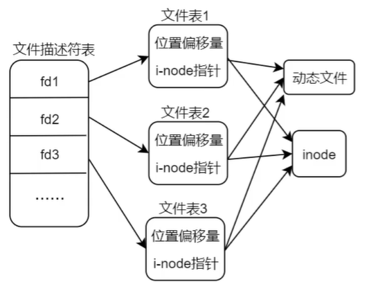 当多个独立的文件读写单元对同一个文件进行操作 时发生文件共享,文件共享的常见情况有多个进程间使用open打开同一个文件 、同一个进程多个线程间使用open打开同一个文件或复制同一个文件的文件描述符。三种常见情况如下图: