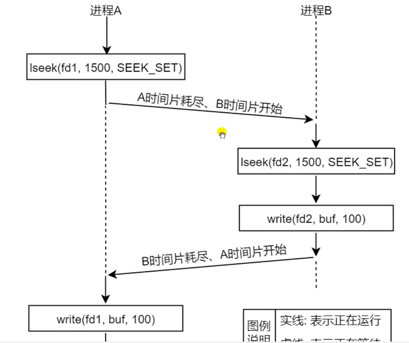 原子操作可以解决竞争冒险,原子操作指的是一系列不会被分割的操作 ,具体的标志就有O_APPEND,pread和pwrite函数,O_EXCL。对于上图中竞争冒险的发生就可以在打开文件时使用O_APPEND 标志来解决,当open中使用了该参数后,移动读写指针到文件末尾和write操作就成为了原子操作 不会被分开就可以在多进程间成功的在文件内容的末尾对文件进行追加写,需要注意的时该指针的移动只会对写文件有用对读文件还是会从文件的头部开始 ,pread和pwrite函数 和read及write函数一样都是对文件内容进行读写不同的是pread和pwrite比其多了一个偏移量参数 用来移动读写指针,且移动读写指针的操作和读写操作成为了一个原子操作 。O_EXCL 则通常与O_CREAT一起使用用来将判断文件是否存在和创建文件组合成一个原子操作。