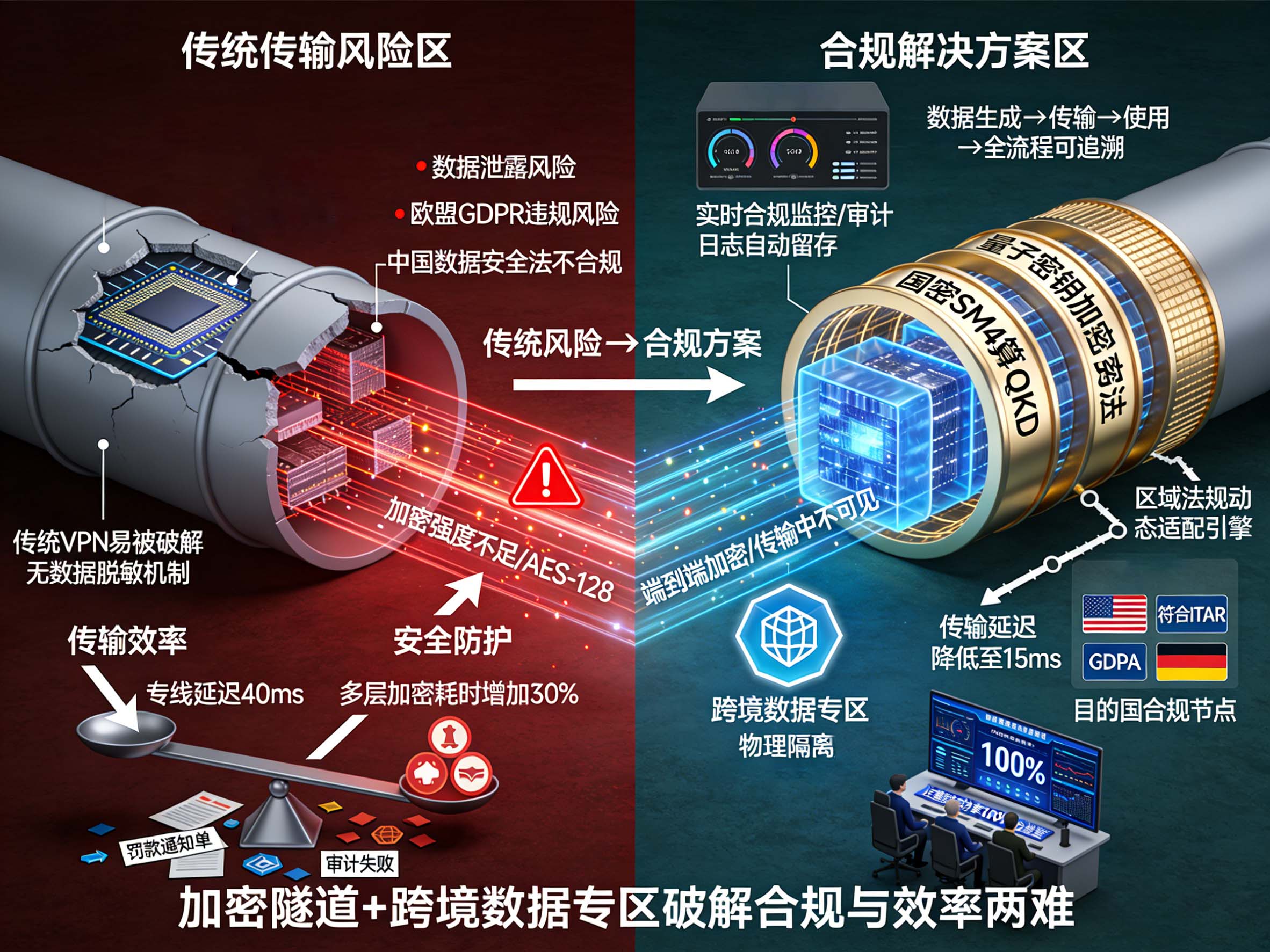 工艺参数、EDA图纸等核心数据跨境传输,需同时兼顾信息保密与区域合规要求,运维团队常陷入传输效率与安全防护的两难困境。**半导体数据跨境如何满足多国合规?敏感数据如何加密传输?**传统网络加密与追溯能力不足,易引发数据泄露或合规处罚风险。