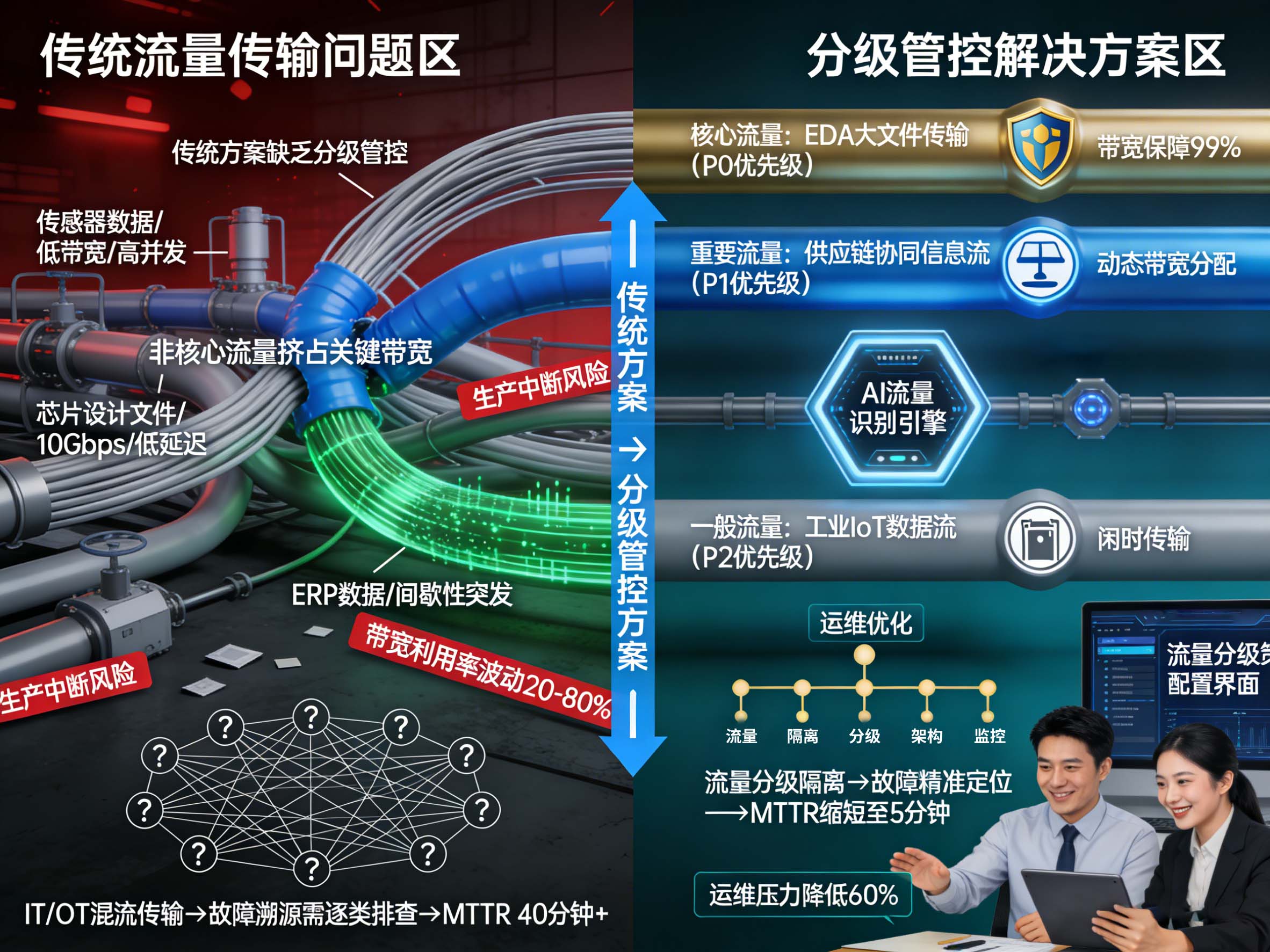 工业IoT设备数据流、EDA大文件传输流、供应链协同信息流等多元流量特性差异显著,传统方案缺乏精细化分级管控能力,易出现非核心流量挤占关键带宽的问题。且因IT/OT流量混流传输,故障溯源需逐类排查,传统运维模式下MTTR长达40分钟以上 ,大幅加重运维团队的流量调度与故障应急压力。电子制造多类型流量如何分级管控?运维如何缩短跨厂故障排查时间?