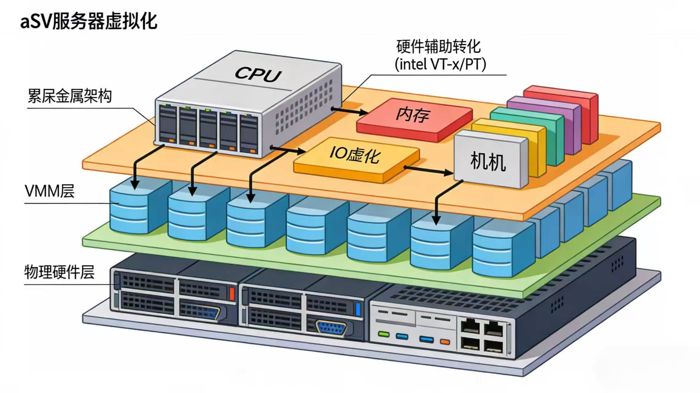 aSV 是深信服自主研发的服务器虚拟化技术,基于裸金属架构(Type-I),直接运行在物理硬件之上,负责对 CPU、内存、IO 等计算资源进行抽象和调度,为虚拟机提供高效、稳定的运行环境。