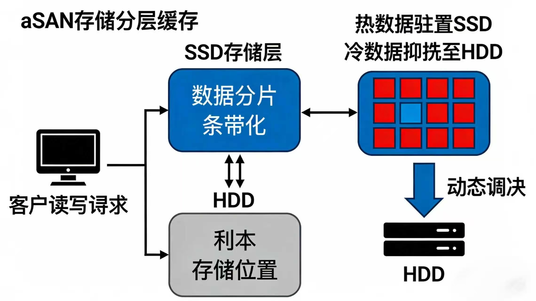 - 性能优化技术:通过数据分片(默认 4G)和条带化技术,实现数据并发读写;SSD 分层缓存机制基于数据热力智能调度,热数据驻留 SSD,冷数据淘汰至 HDD,同时抵抗扫描读对缓存的挤占。