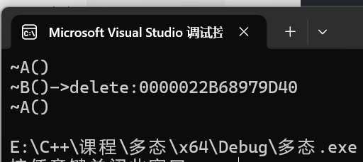 注意:如果~A(),不加virtual,那么deletep2时只调⽤的A的析构函数,没有调⽤ B的析构函数,就会导致内存泄漏问题,因为~B()中在释放资源