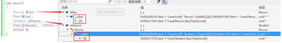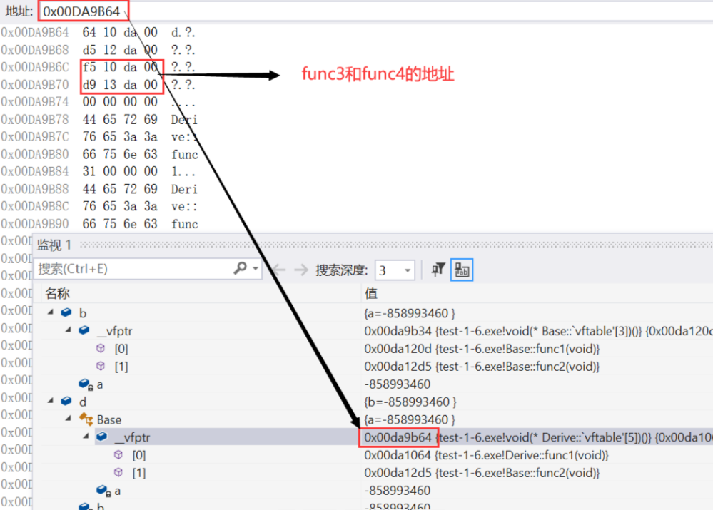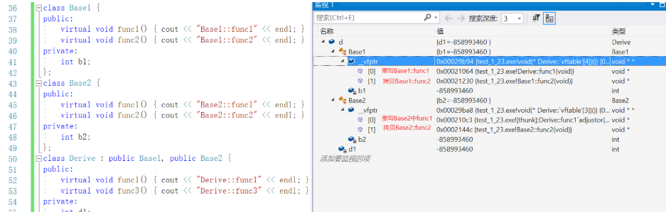 我们看到Derive中自己的虚函数func3在监视窗口并没有,那么怎么证明它是存在的呢?和上面其实是一样的,只不过打印第二张虚表有些不一样: