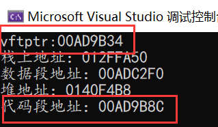 可以看到它是更接近代码段地址的,所以虚表是存在代码段的。虚函数编译出来函数指令跟普通函数一样,存在代码段,虚函数地址又被放到虚函数表中