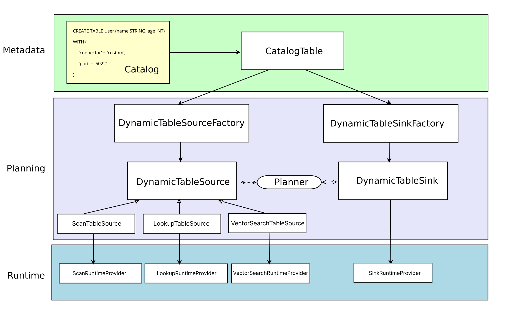 首先是最上层的 MetaData,CREATE TABLE 会更新 Catalog,然后被转换为 TableAPI 的 CatalogTable,CatalogTable 实例用于表示动态表(Source 或 Sink 表)的元信息。