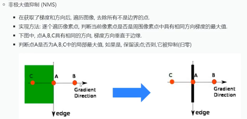 如上图,整体梯度方向上取梯度值最大的作为边缘。