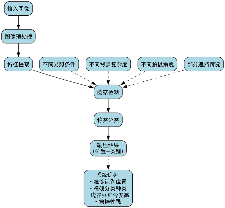 图展示了模型在不同场景下的检测结果,包括不同光照条件、不同背景复杂度和不同拍摄角度的情况。从图中可以看出,模型在各种情况下都能准确地识别出蘑菇的位置和种类,边界框贴合度良好,分类标签准确无误。特别值得一提的是,对于部分遮挡的蘑菇,模型仍然能够正确识别,显示出较强的鲁棒性。