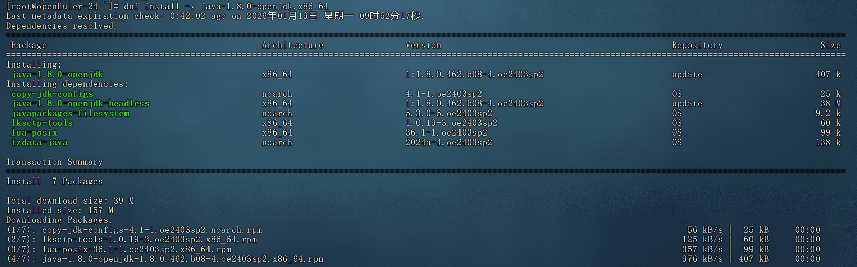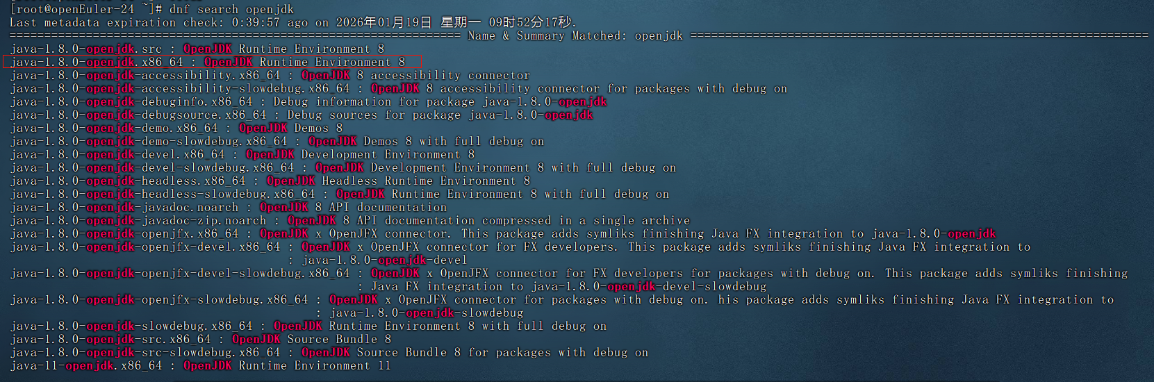 Tomcat 是纯 Java 编写的,必须依赖 JDK。Tomcat 9 要求 JDK 8 或更高版本。我这里使用 OpenJDK 8(LTS 版本,性能好、安全性高),openEuler 官方源已提供。