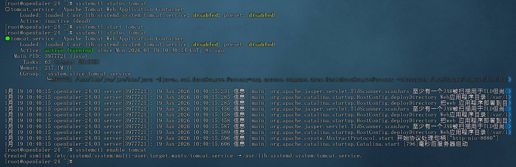 使用dnf在线安装完成tomcat默认注册了systemd系统服务,但是没有启动。启动命令如下:
