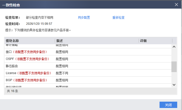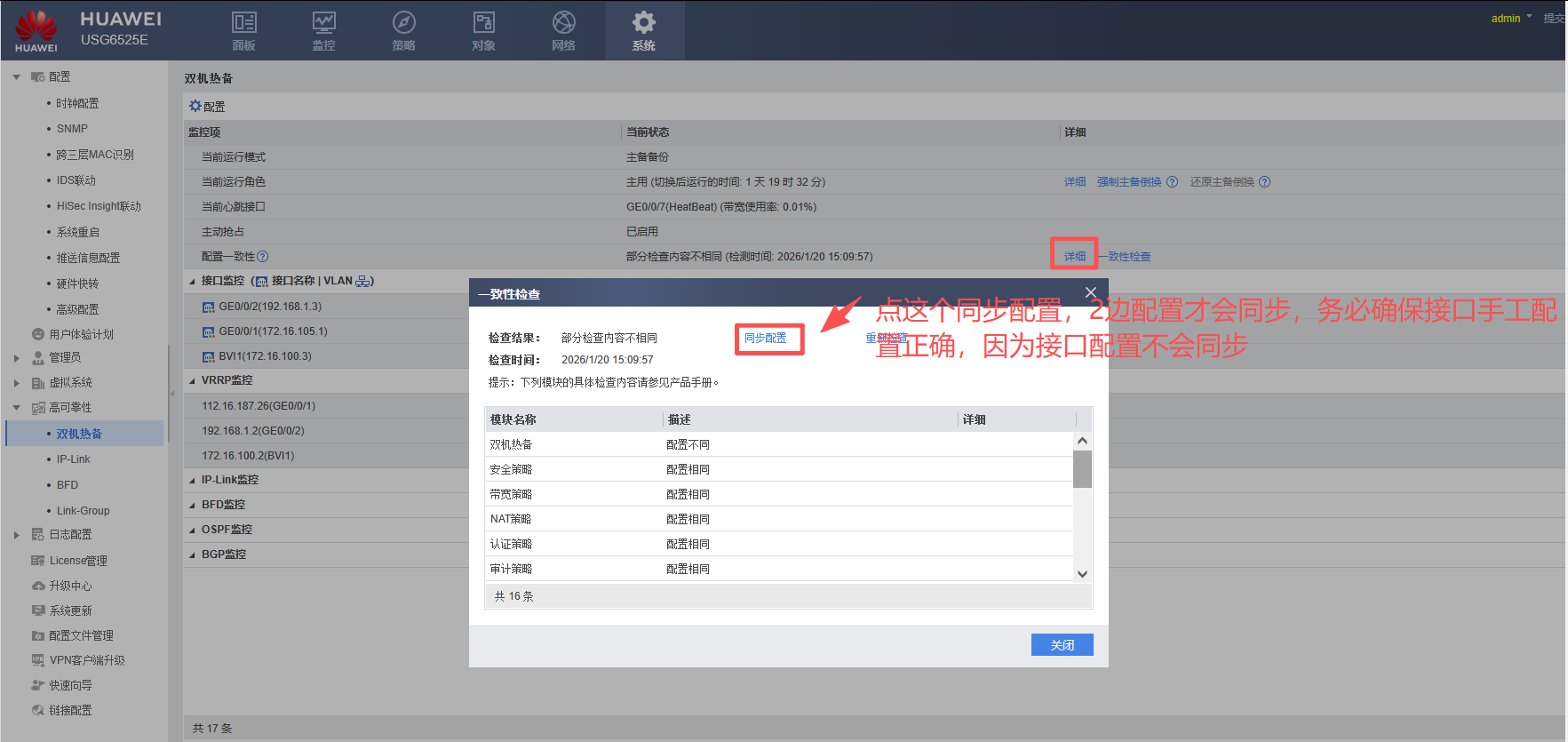 华为这个版本V600R007C20SPC600 我们没有发现配置自动同步的命令,高版本具备配置定时自动检查和同步命令,命令如下(主备机都要配置):