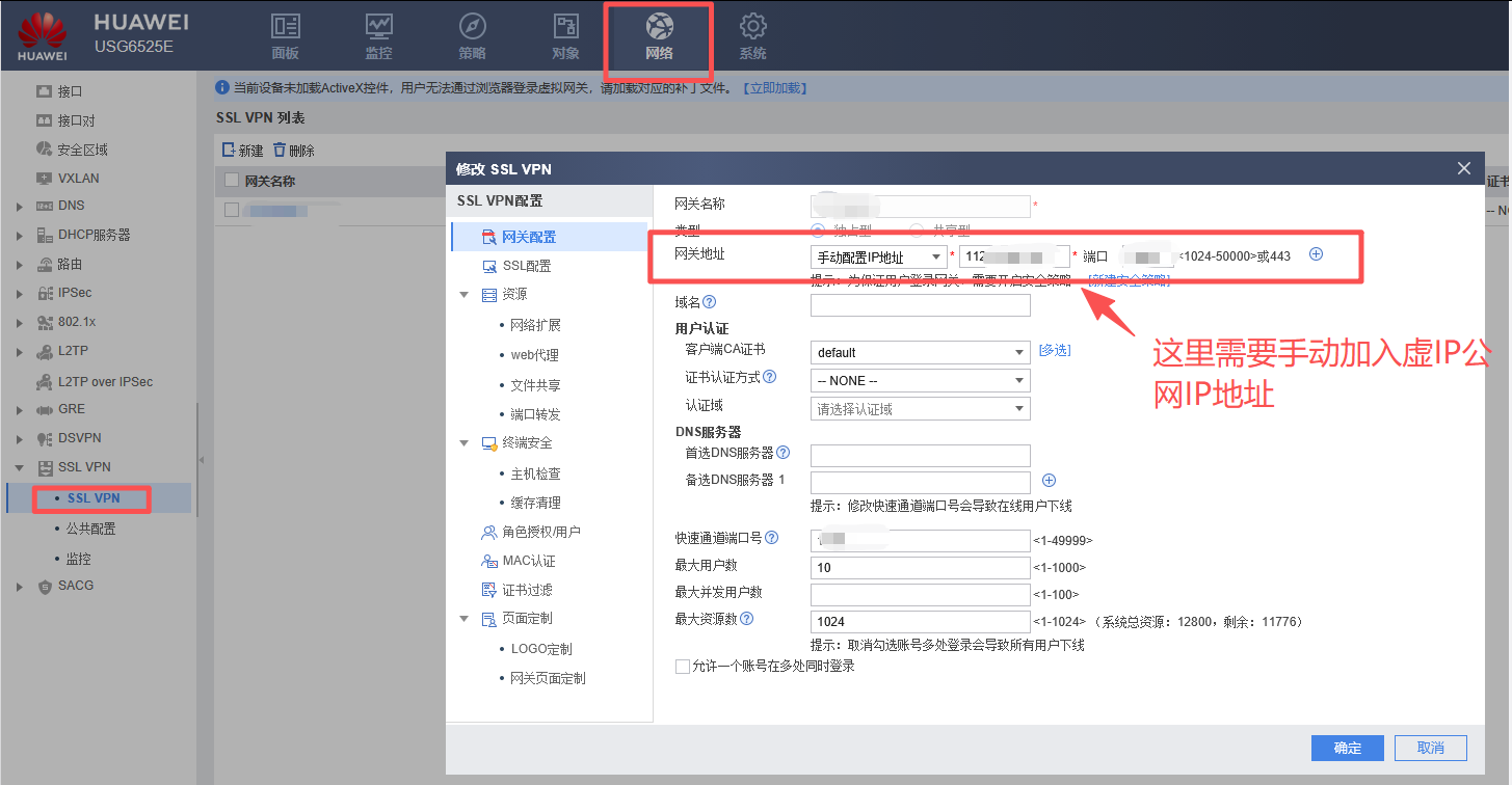防火墙做完HRP之后,需要注意的地方主要包括SSLVPN创建的时候网关地址需要手动填写虚IP地址,无法选择了,因为接口地址实IP是无法使用的,截图如下: