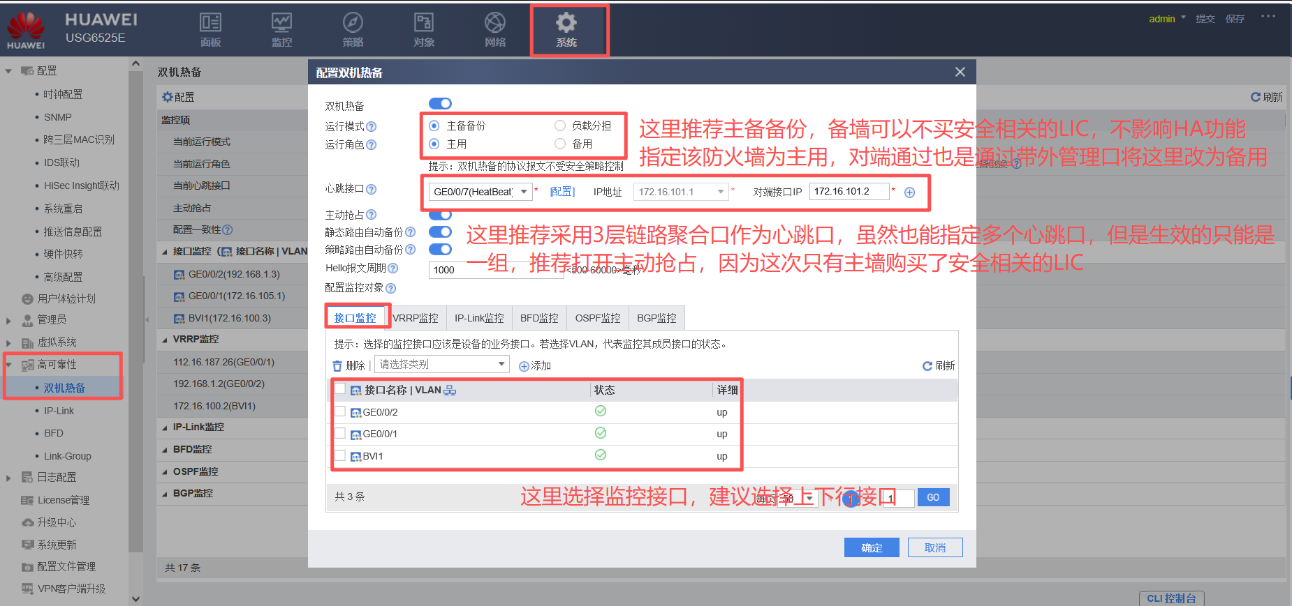 备机也是这样去配置,但是接口地址IP实IP全部改下和主防火墙不同,因为要跑VRRP,物理接口配置完后,进入到HRP高可靠性业务部署: