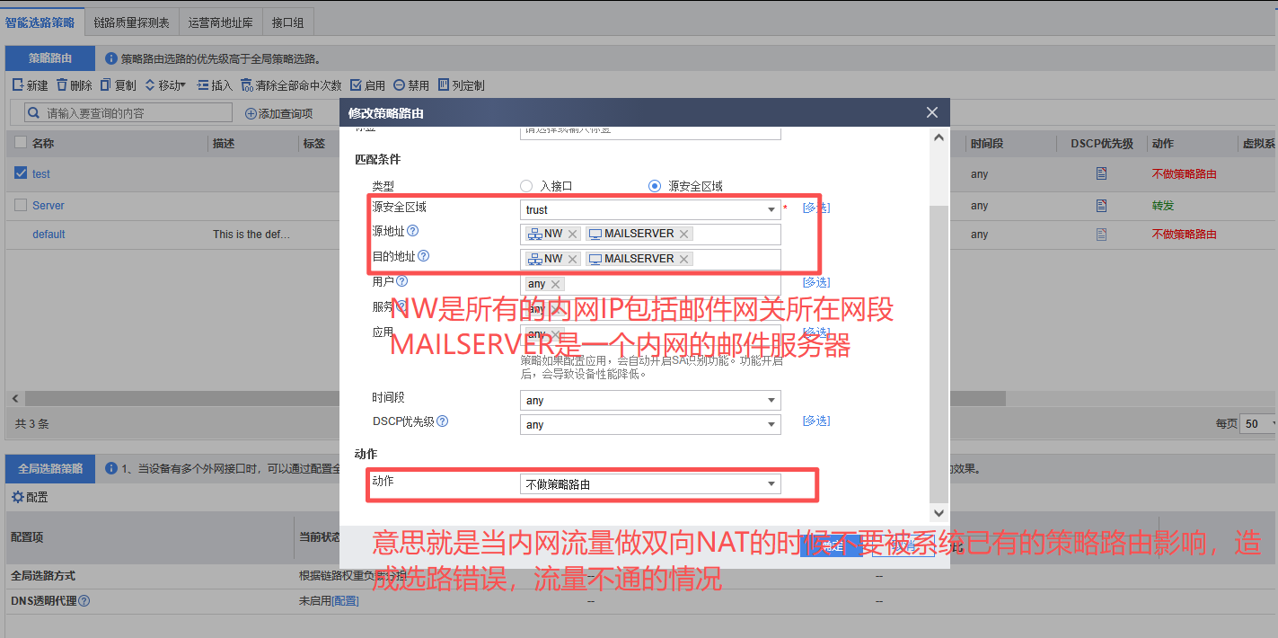 正常这样配置完就可以了,但是如果遇到策略路由,可能会有问题,流量可能不是按照我们的想法走,这个时候需要增加一条策略路由,动作是不做策略路由如下,避免双向NAT被系统已有的策略路由影响: