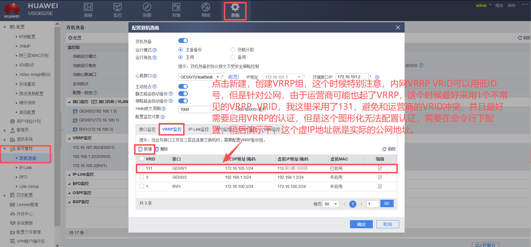 接下来配置VRRP:点击新建就是创建,内网VRRP VRID和IP没关系,按照正常逻辑创建即可;公网IP由于运营商只给了1个公网IP,这个时候,在接口上实IP用一个内网没在用任意私网IP,然后VRRP虚IP则配置运营商分配的公网IP地址,如果配置完毕后发现无法PING同公网网关地址,这里有2个坑,首先是运营商锁定MAC地址的问题,如果你换上之前的网关MAC可以通信,但是改了一个MAC地址就无法通信,说明运营商将你设备的MAC绑定了,需要联系运营商取消这个动作;还有一个由于采用了VRRP,运营商侧可能也用了VRRP,并且VRID和我们自己配置的冲突了,这也会导致网关异常,无法PING通运营商网关,这个时候需要仔细选择1个不常见的VRID号,并且最好启用vrrp认证,但是图形化无法配置vrrp认证,需要在命令行下配置,这个我后面演示,备机也是创建相对应的vrrp vrid ,实IP不同,虚IP相同。