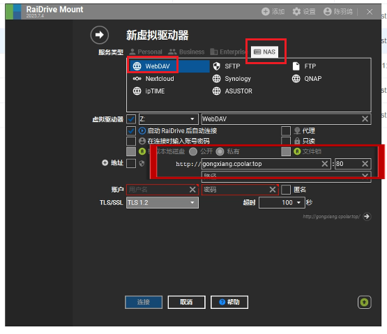我们点击nas选择WebDAV,虚拟驱动器这里可以自定义设置,我这里默认