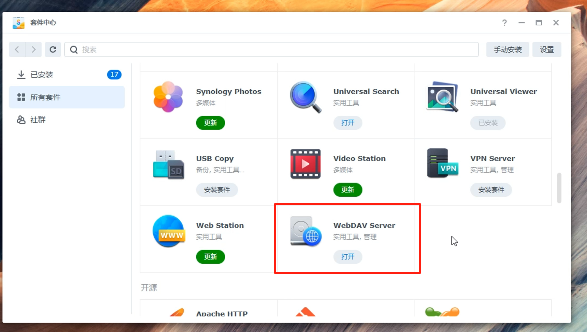 首先打开群晖的套件中心,选择所有套件,找到webDAV打开安装