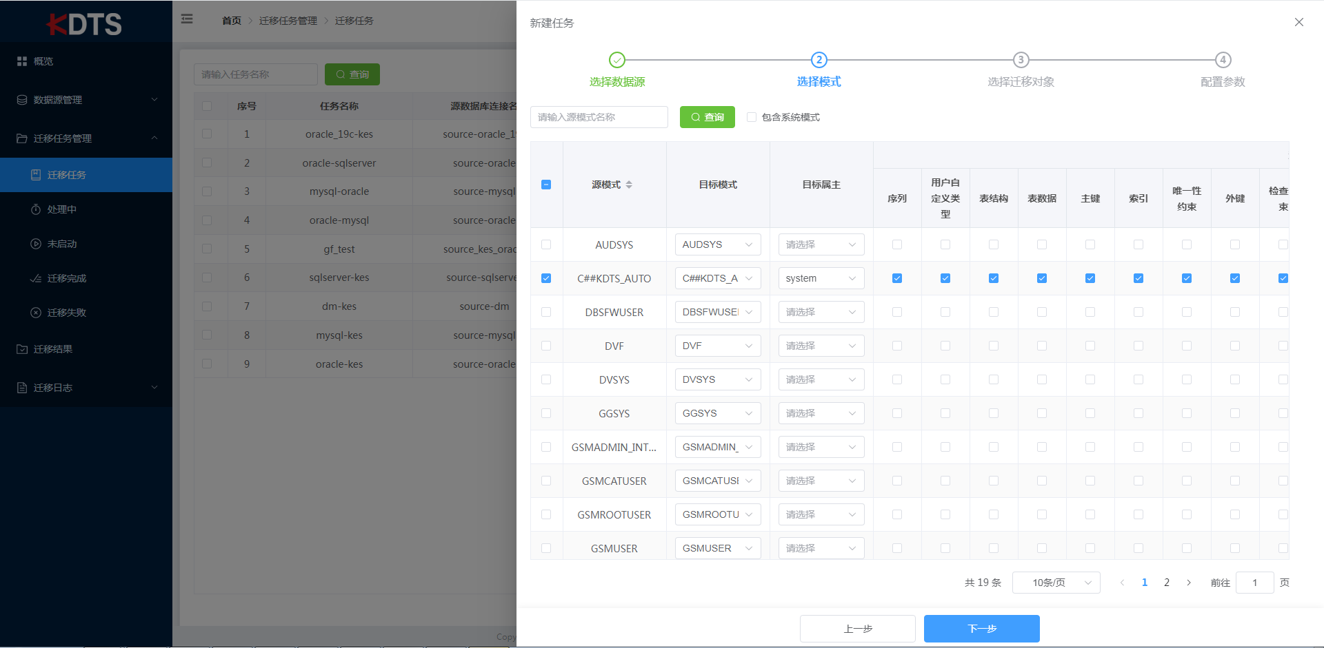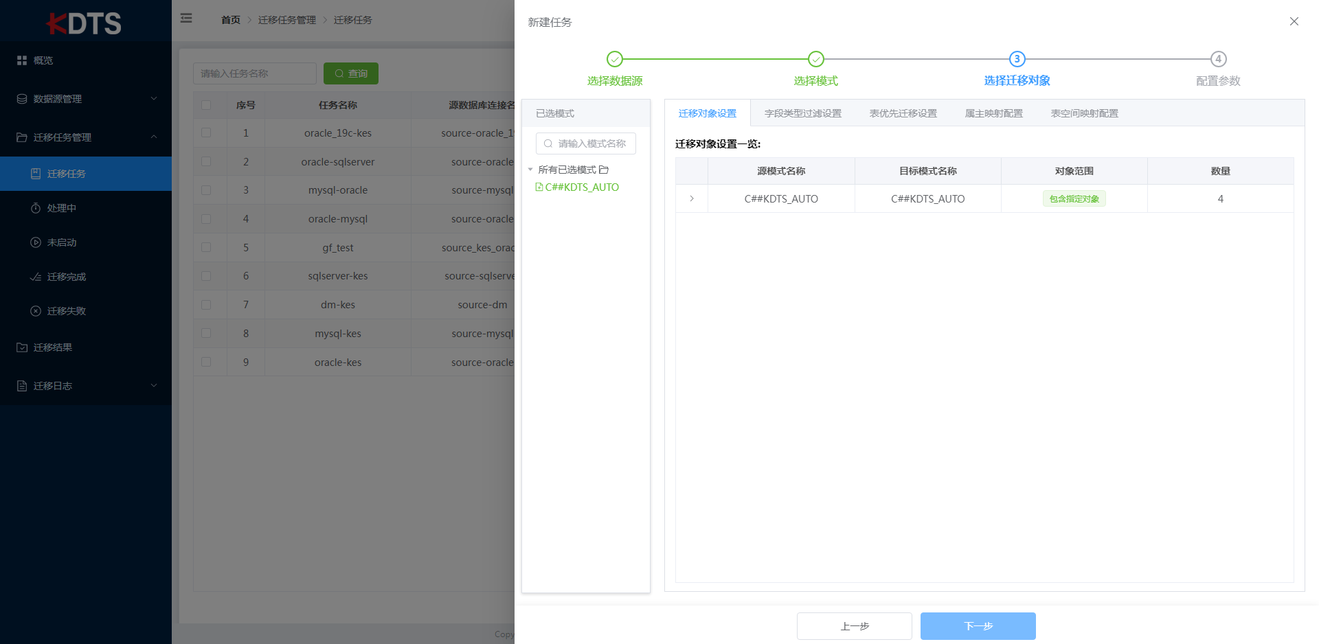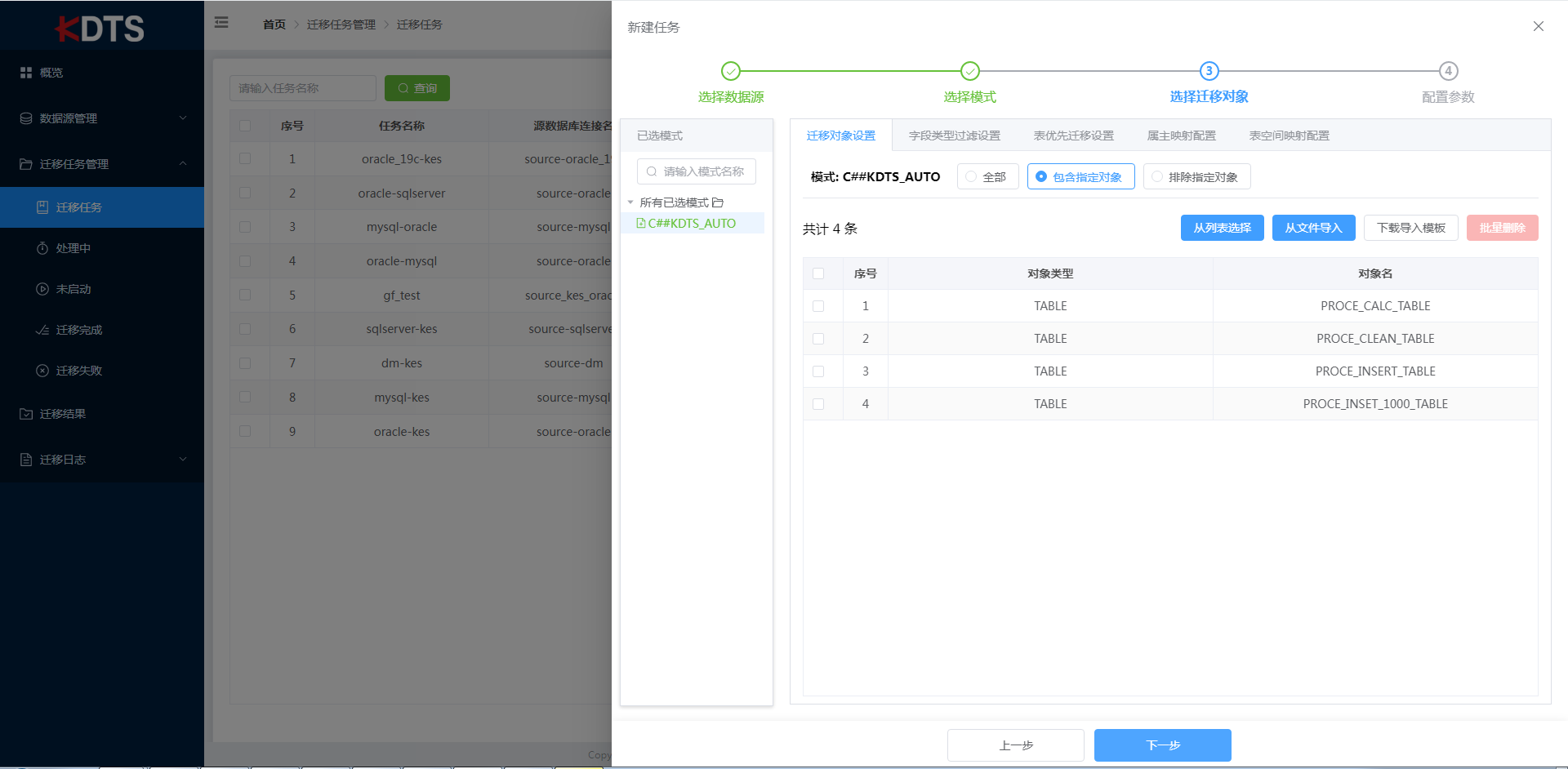 3) 配置要迁移的源库模式,数据库对象,涉及到的参数见下图: