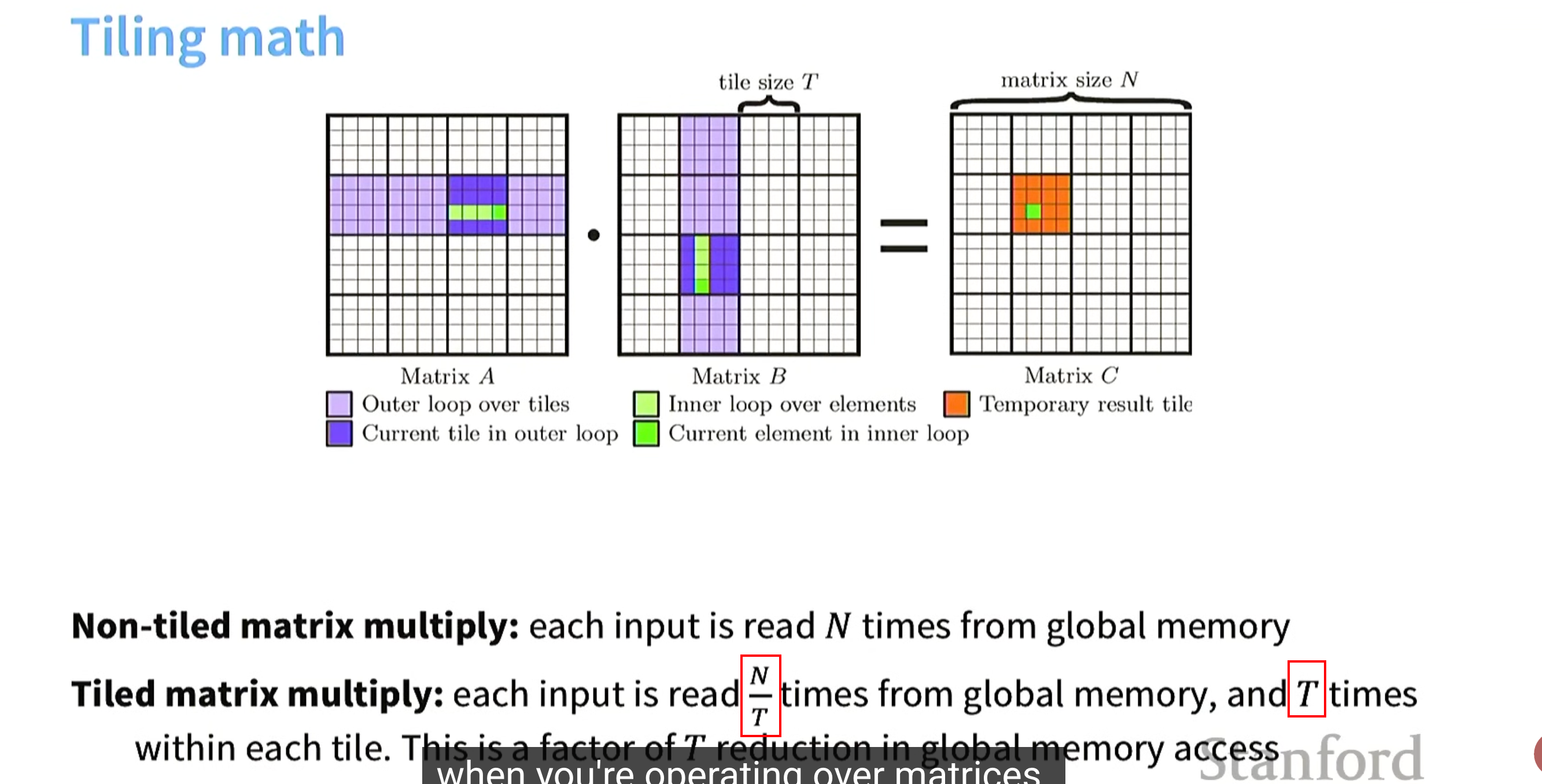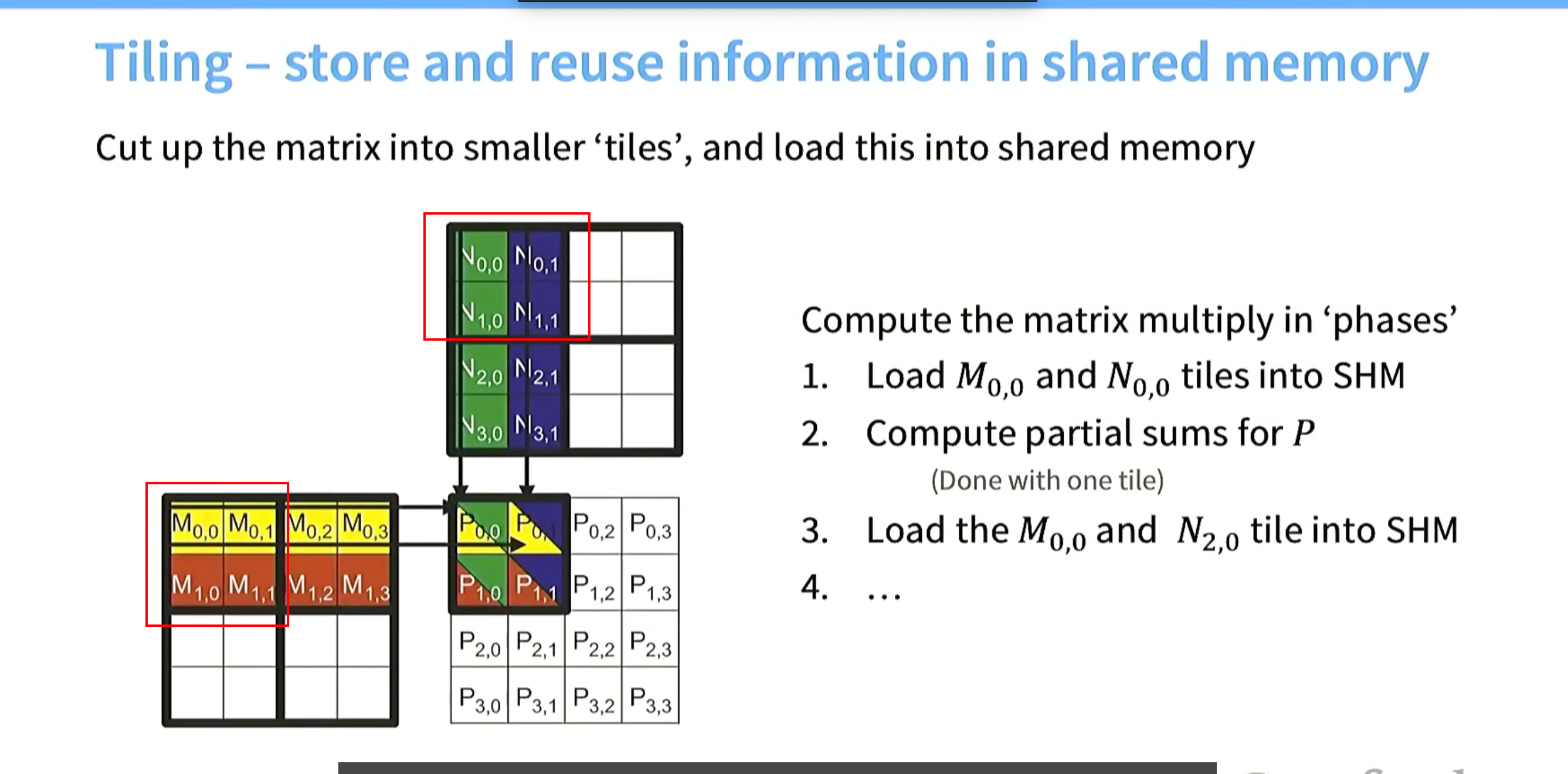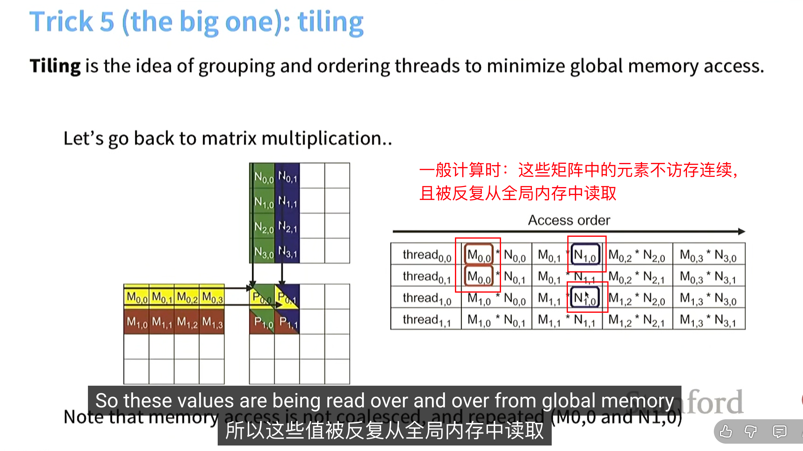 Tiling解决方案:从全局内存 加载一部分数据(尽可能多)到 共享内存中(加载到时候可以按列索引 进行内存连续),共享内存进行运算。