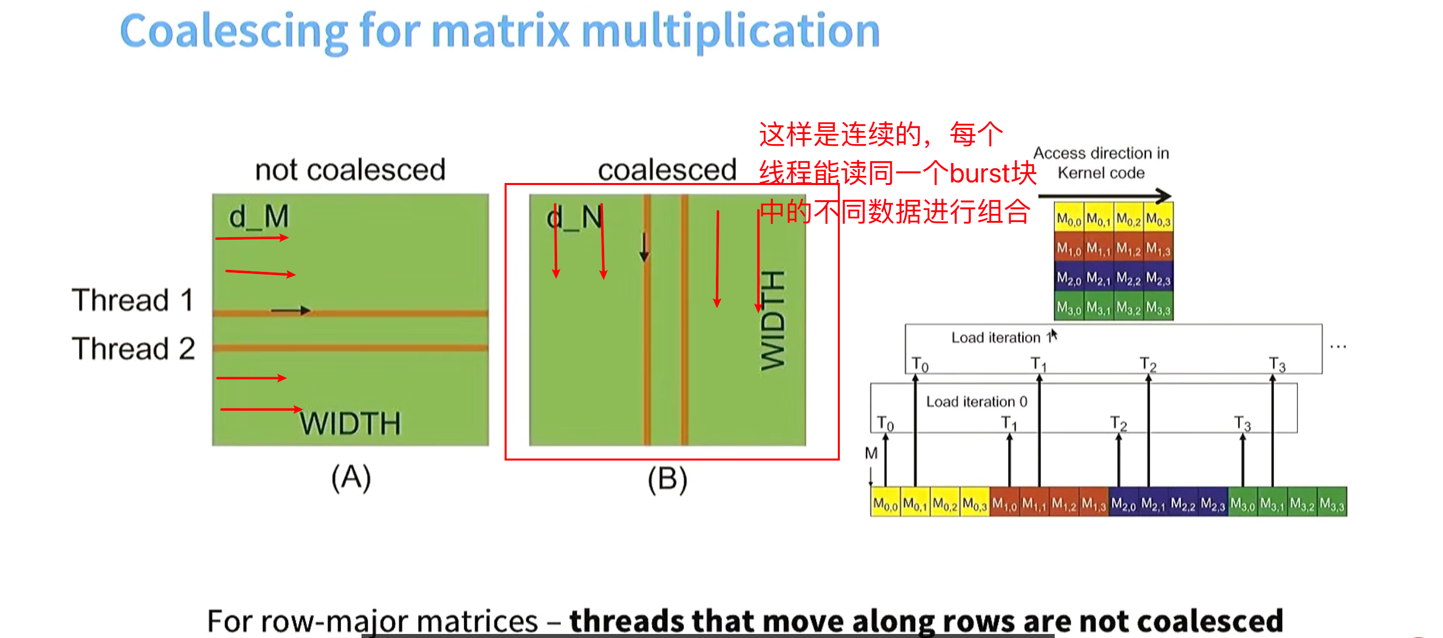 在 row-major 矩阵中,真正按列访问(m00, m10, m20)是非合并的 ;