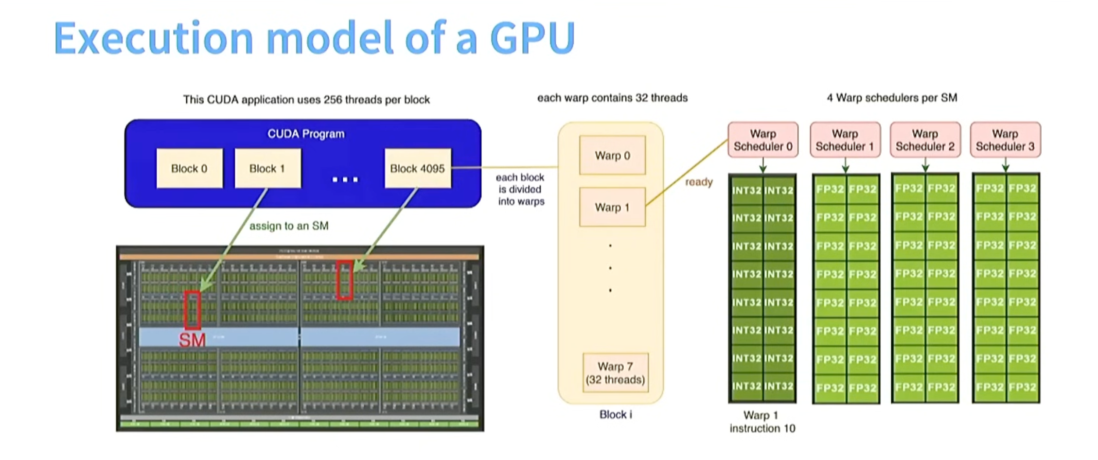 cuda的每个block对应gpu中的每个sm(stream multiprocessor ), cuda的一个block可以分为多个warp,一个warp内有32个线程(在不同的数据上执行相同指令)
