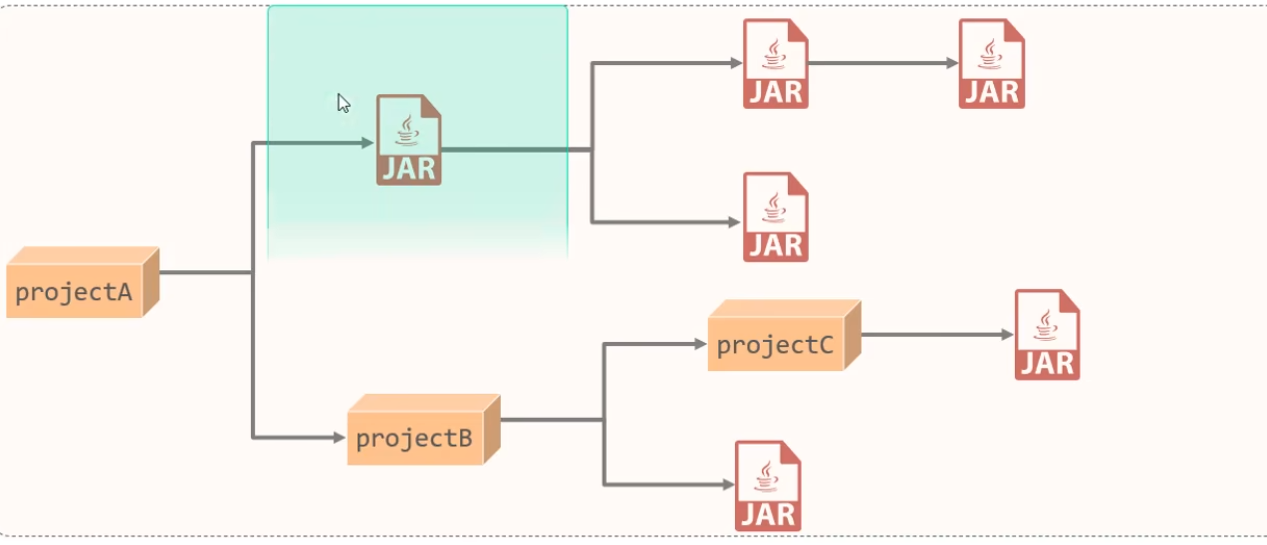 间接依赖:被依赖的资源如果依赖其他资源,当前项目间接依赖其他资源